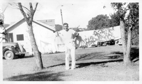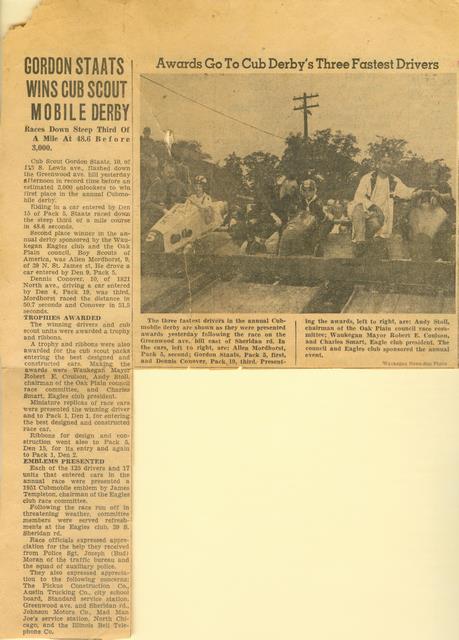 There were also two newspaper clippings, about his dad playing softball and he and his dad winning the Cub Scout Derby. According to Denny, Al Hawley (Elaine's husband) helped build the derby car (soap mobile) when they lived in Waukesha, Wisconsin. He also helped build one for Denny, but he didn't win that year. The hill they raced on was the one the went down to the Johns Manville plant, which should be Greenwood Ave (although Denny thought is may have been Glen Flora Avenue). Al and Elaine moved the family to California after the death of their daughter Sharon from Polio in 1952 at age 8.