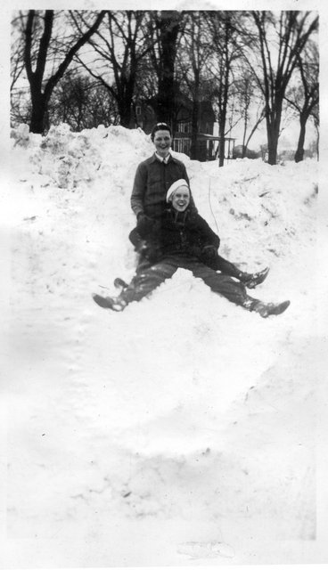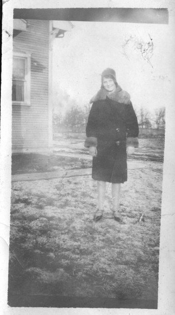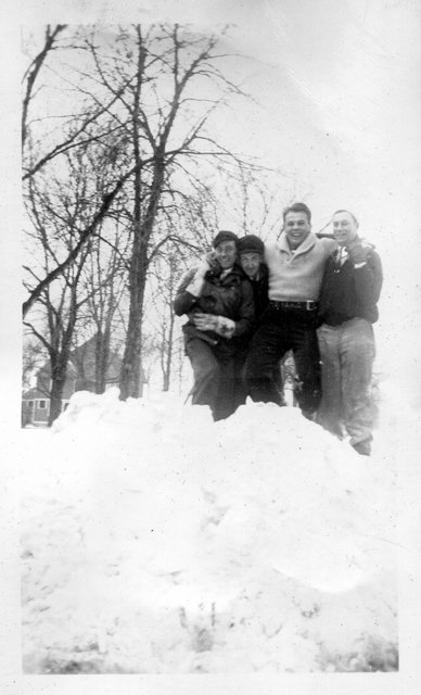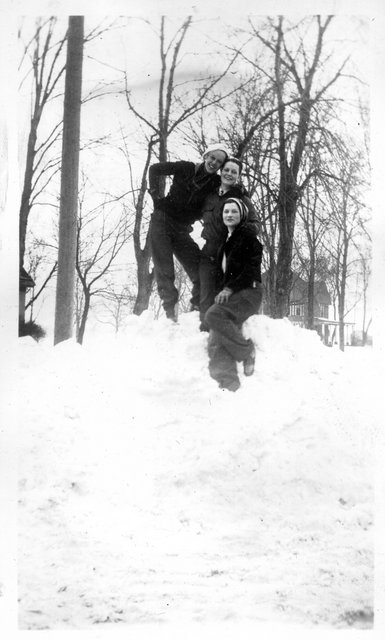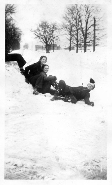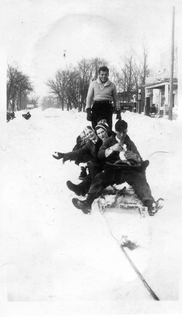 Here are some photos of Verna in the snow, she is the third from the front on the sled, and in the back against the snowbank. It looks like the same person I assume to be Elain behind her on the sled and with her on the snow bank. If these are the Schuelkes, then the young boy is Bill, who is 13-years younger than Verna, and the two boys are likely Glen and Bill who are one and two-years older, respectively. Gete, Pearl and Vera were the oldest, 5, 6, and 13 years older than Verna, respectively, so one of them may be the girl in front of Verna.