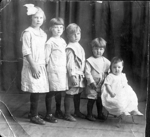 This may also be the Schuelkes. None of Gordon's or Verna's siblings had five children. The girl-girl-boy-boy-baby order would work for Gordon's family, but not the ages as he was ten years younger than his nearest sibling, Clyde. This would match the Scheulke's (if you take out Vera, who Uncle Denny believed may have been adopted) with Pearl (1907), Gete (1908), Bill (1911), Glen (1912) and Verna (1913) (Elaine (1916) and Leslie/Bud (1926) would not be pictures). The ages and sexes may match (they boy I think might be Bill may look too old). Wish I could confirm this somehow.