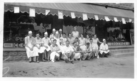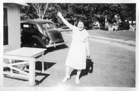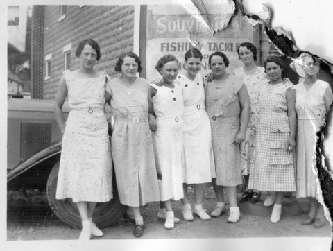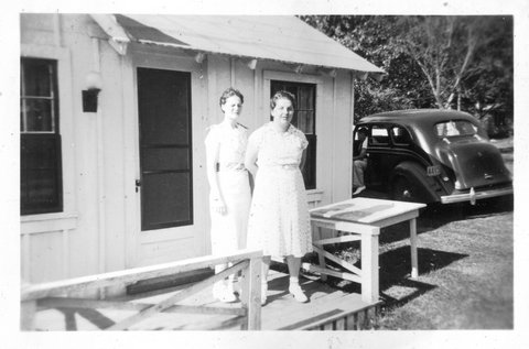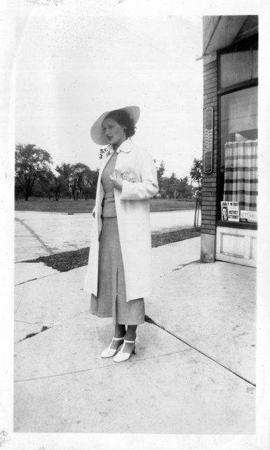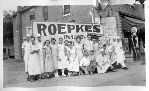 Here are a couple photos of a younger looking Verna working at Roepke's in Twin Lakes, WI, which is near their Wilmont farm. Due to the one sign, this is the ONLY clearly identifiable location in the album (other than the general Wisconsin Dells area). If the girl with Verna is a sibling instead of a friend, it could be Elaine, who was three years younger (her next two oldest siblings were brothers Glen and Bill, the next older was Marguerite, who was five-years older). As she appears again in the album and they were wearing matching dresses, I assume this is Elaine or Gete (I never met Elaine and while I clearly remember Gete, she was so much older than that I can't tell if this is her or not).