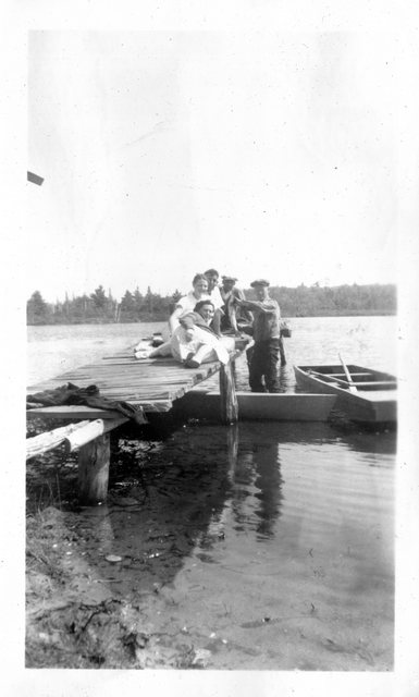 Verna caught a nice fish, while she and Gordon are in the middle of this group on the dock. Denny stated Gordon had the record for the largest northern pike ever caught in Mud Lake. The last three look like they're on a different dock (boards are facing the other way and the shore is farther away), and could easily be from the cottage on Bootjack.