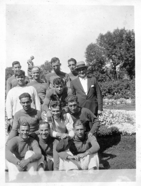 He is in the back just behind the coach in the left two group pictures, and center back in the third.