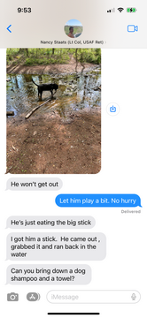 So on Sunday, Nancy walked him, while Steve got the bikes out and ready for a ride. She had been gone a while when she texted these pictures, and shortly later a text message saying "he won't get out." It took a while for them to get home.