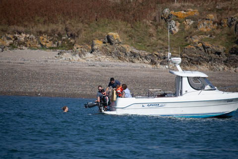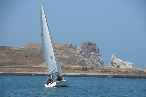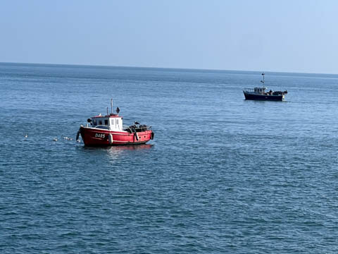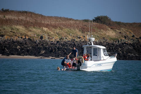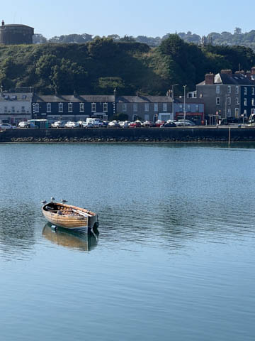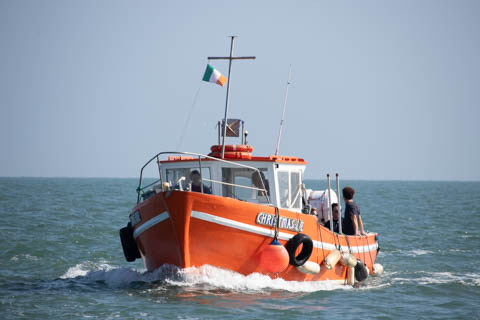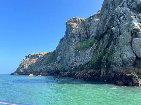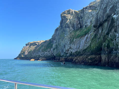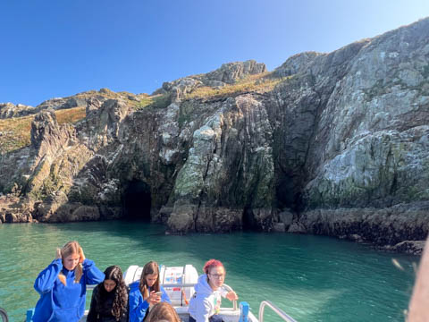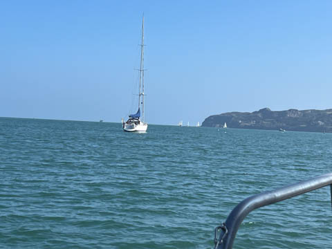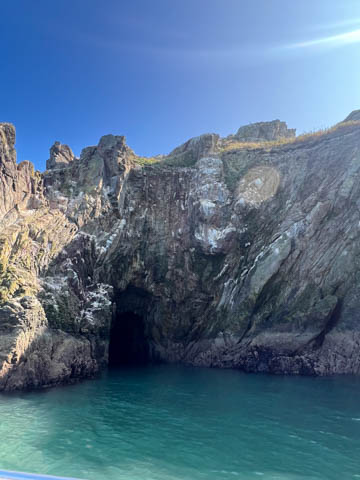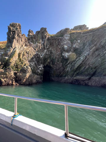 We then headed back out the quay to meet up with a tour boat which we had learned was run by the same company as the ebike tour. In fact the girl checking our tickets was our ebike tour guide's niece. We had to wait a bit for a group of Italian students who quickly got split into the two waiting boats. We headed out toward Irelands Eye, passing a couple other boats and a sailboat in the passage.