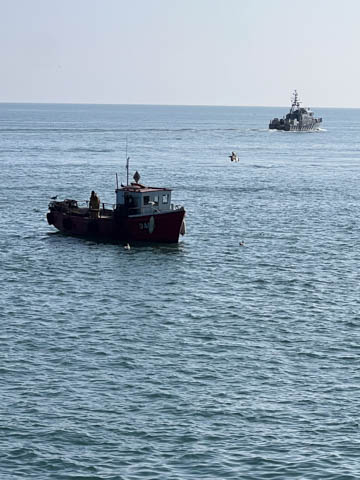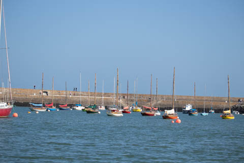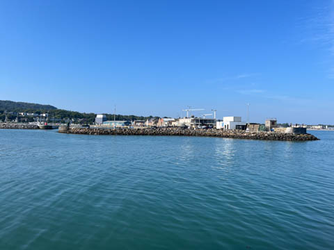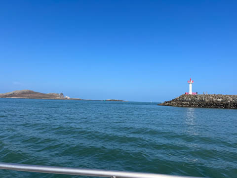 There was a lighthouse at the end of the breakwater, with several boats going in and out of the harbor entrance marked by the lighthouse and the quay on the other side with a row of fish restaurants.