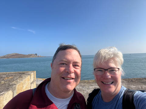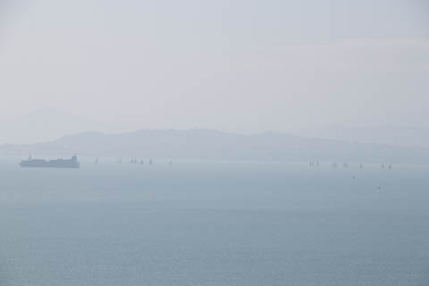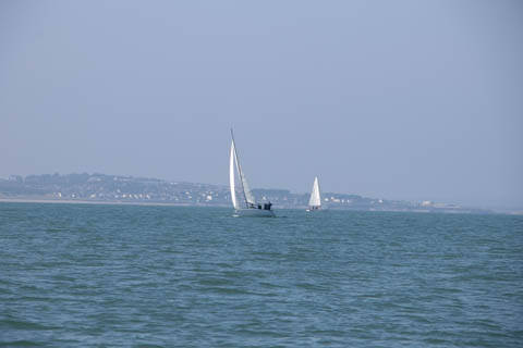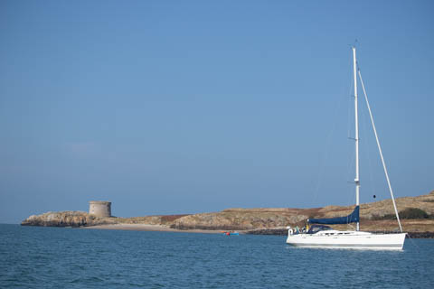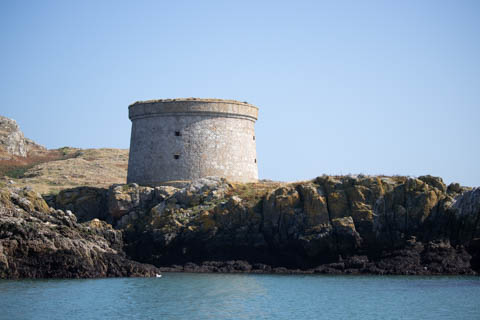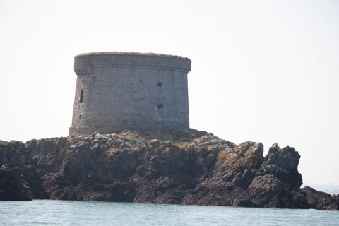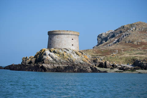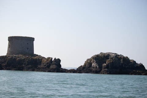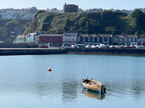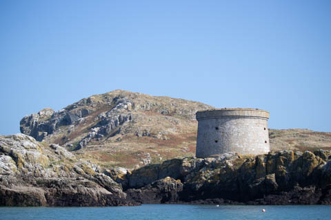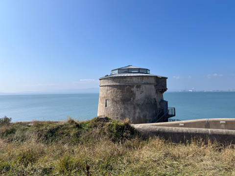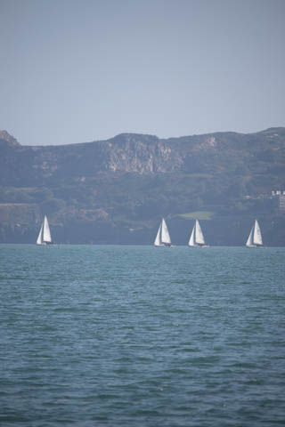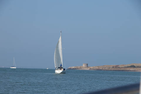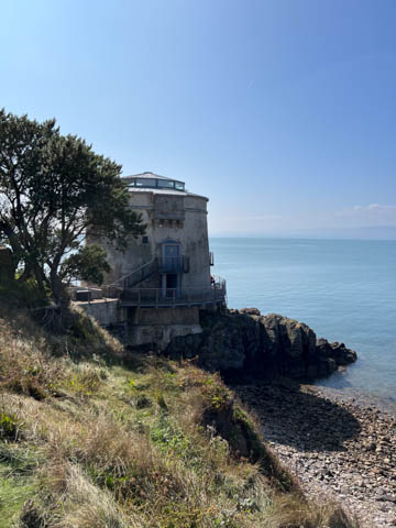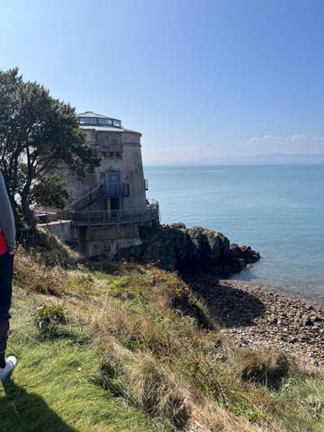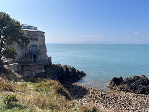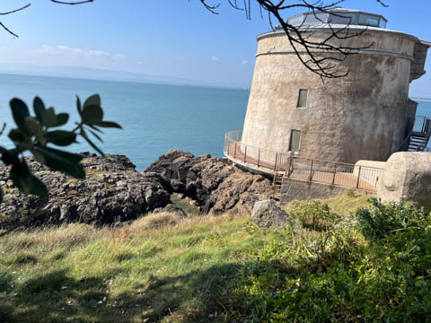 We headed west away from the harbor toward the neck separating the peninsula from the mainland, crossing to the south-western side to look back at Dublin back across Dublin Bay. We admired the couple islands (which were created by dredging) which are home to a number of bird species. We eventually stopped again at a small tower, which turned out to be Martello Tower Sutton. This was built in 1804 as one of about 50 similar towers around the island to help warn of an invasion from Napoleon's France. These were all modeled on a tower near Mortella in Corsica, which the British could not take and who's architecture left a lasting impression (even if the correct name didn't). The idea was to have overlapping views where defenders could light a fire or launch a flare providing warning down the line of towers on the coasts. This tower was restored and is now a rather expensive bed & breakfast. We enjoyed looking south across the bay to see what looked like a sailboat regatta.