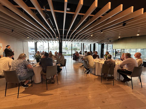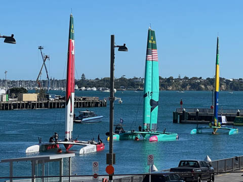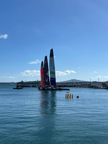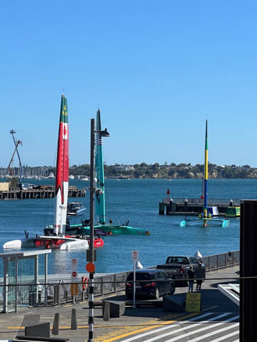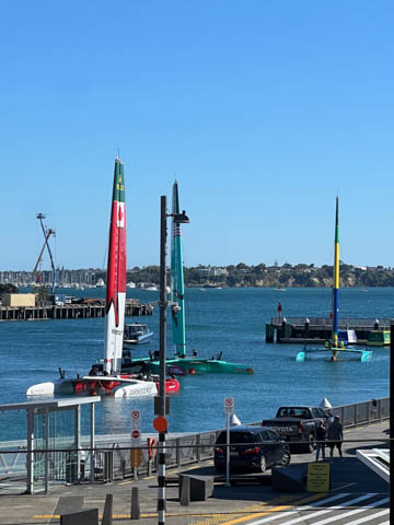 Steve was very excited to discover that SailGP was in Aukland, with their race scheduled for the next weekend. This meant they were out practicing. Even better, their facility was literally across the street from our hotel and we were able to see them get the boats in and out of the water each day. This was only the second race of the twelve-month season after the opening race in Dubai, and was their debut race in Aukland. "The Championship sees rival teams from the USA, Australia, New Zealand, Great Britain, Brazil, Italy, Canada, France, Denmark, Germany, Switzerland and Spain battle it out at iconic venues around the world in short, intense races for a total prize pot of USD $12.8 million." The teams race identical F50 (Foiling-50 ft) catamarans, whose foiling designs allow the hulls to lift out of the water and hit speeds of up to 60 mph, almost four times the speed of the wind powering them. The design is adapted from the AC50s used in the America's Cup, with boats costing about $5M and utilizing a modular wingsail. They have a crew of six people, which must include at least one woman. Really hoping to see them practice before we leave Aukland, which will be before the race begins.
