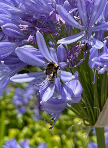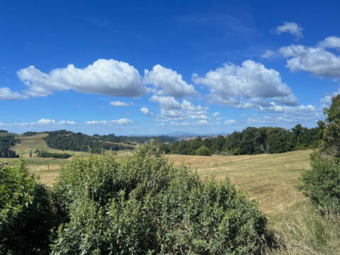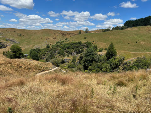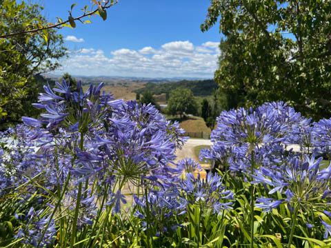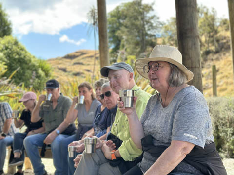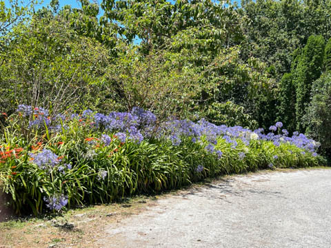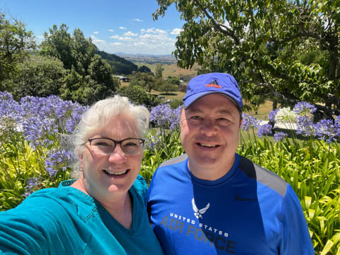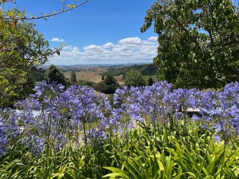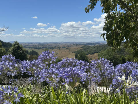 We had about a three-hour bus ride to Waitomo, which is south of Aukland along the western coast. Some fun tightly curved roads toward the end, as he got into the hills. We stopped at Roseland's Resort, enjoying a barbeque lunch and the wildflowers.