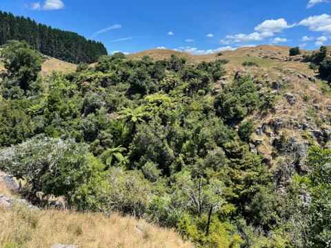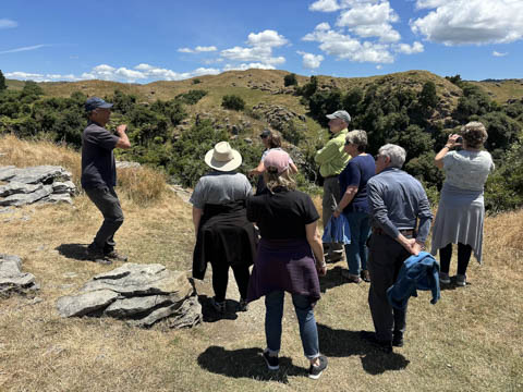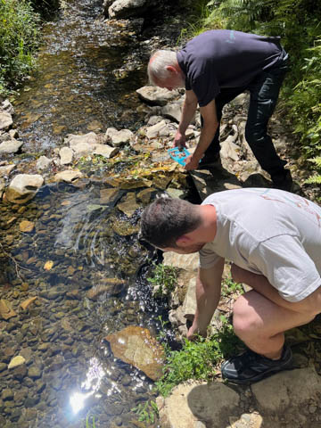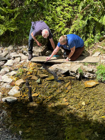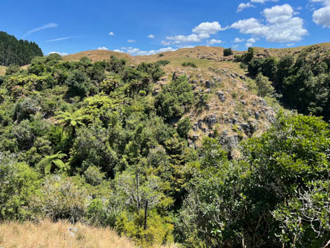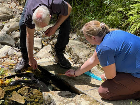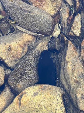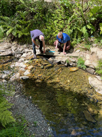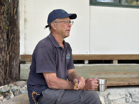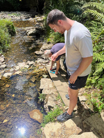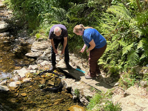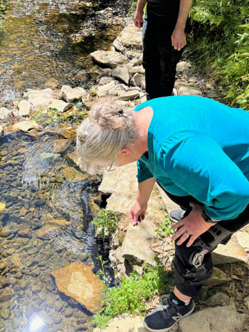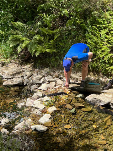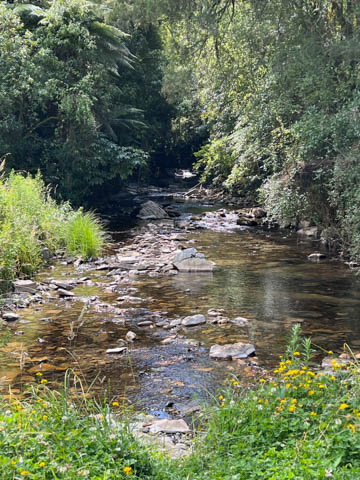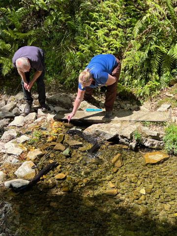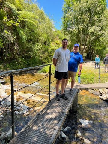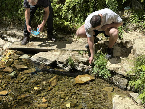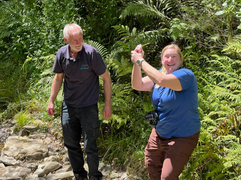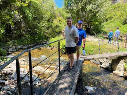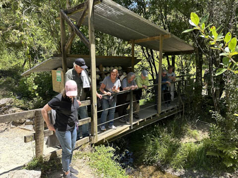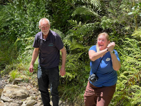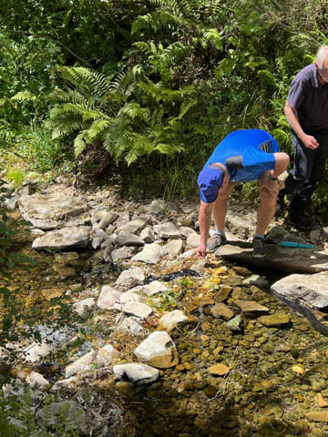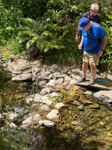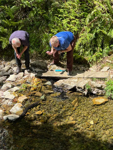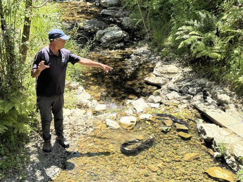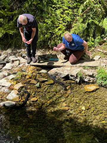 Once we got outside, Mark led us down to the stream which fed into the cave, running underground there for a long way. As with most streams in New Zealand, there were a number of eels nearby. They must have been habituated to him, as he brought food and two were there basically waiting for him. He gave several of us who were willing (including all three of us) an opportunity to feed them.