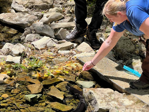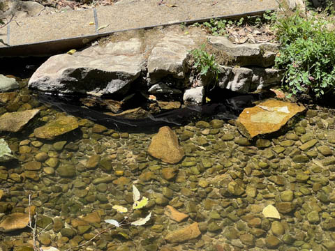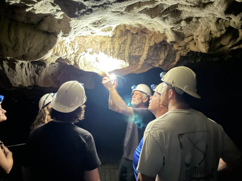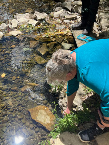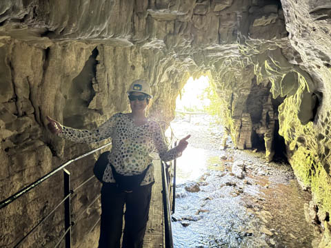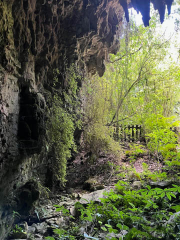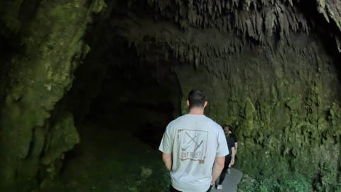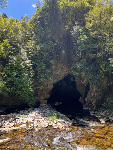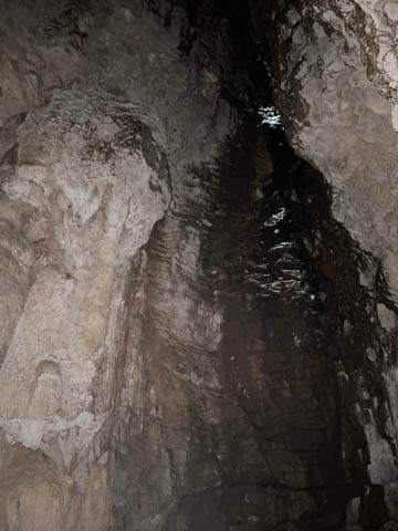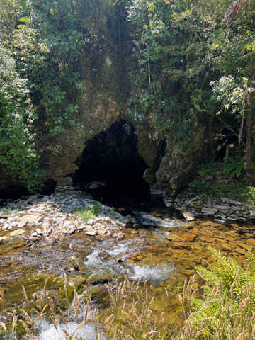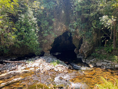 We reached a small cave with a stream heading in. Mark explained the stream fed an underground lake and traveled underground for miles before re-emerging.