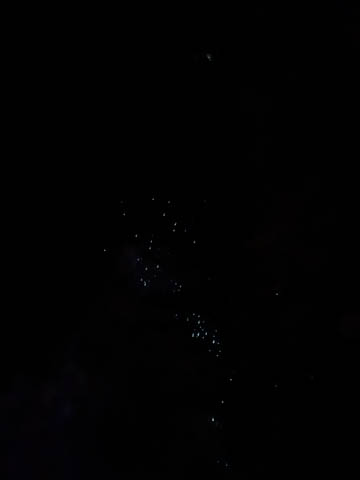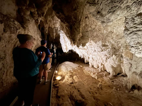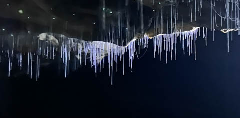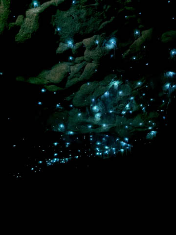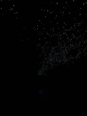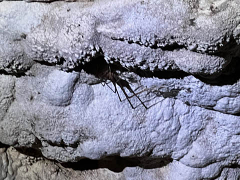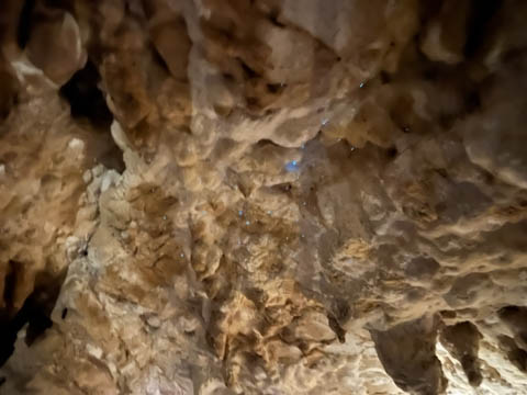 Hard to get a reasonable picture of the glow worms. These weren't actually worms, but fungal gnat larva. In their larval stage, they generate blue-green light to attract prey and product dozens of sticky web-like threads which hang down to catch any prey flying by. These webs led to their name of Arachnocampa luminosa. According to Mark, they are predatory and will eat each other, so they each wind up staking out a small territory allowing them to become somewhat evenly distributed in some areas. They may spend a year as larva, then pupate and emerge as adults, only living for 3 to 4 days.