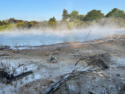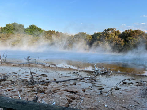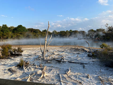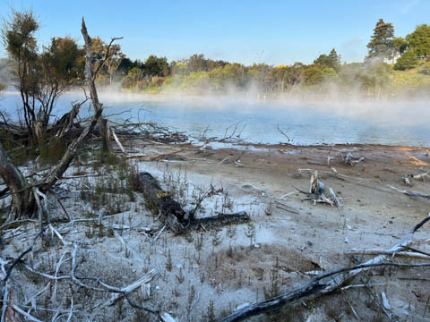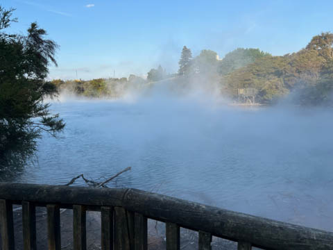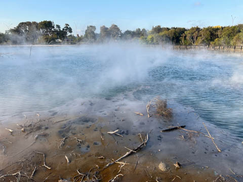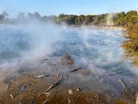 After some tea, we loaded up on the bus for the two-hour drive to Rotorua, which is on the shore of a pretty lake in the middle of the North Island. After checking into our hotel, we had free time for the evening, so wandered to nearby Kuirau Park which we saw on the drive in. This had some wonderful flowers and a number of hot springs and pools (with appropriate warnings not to go in the water with the exception of one small pool which was a lower temperature). Had to laugh at the view from our room of a car park, a bit different than the view in Aukland.