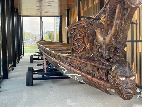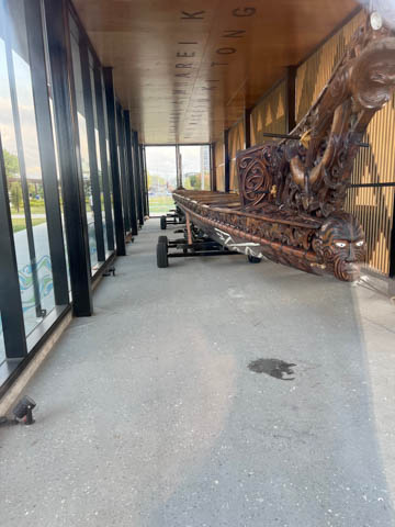 We wandered back along the lake and through a wonderful community park with one of the better play-grounds we've encountered stretching a long way with many different sections. There was also an amazing Maori waka (canoe).