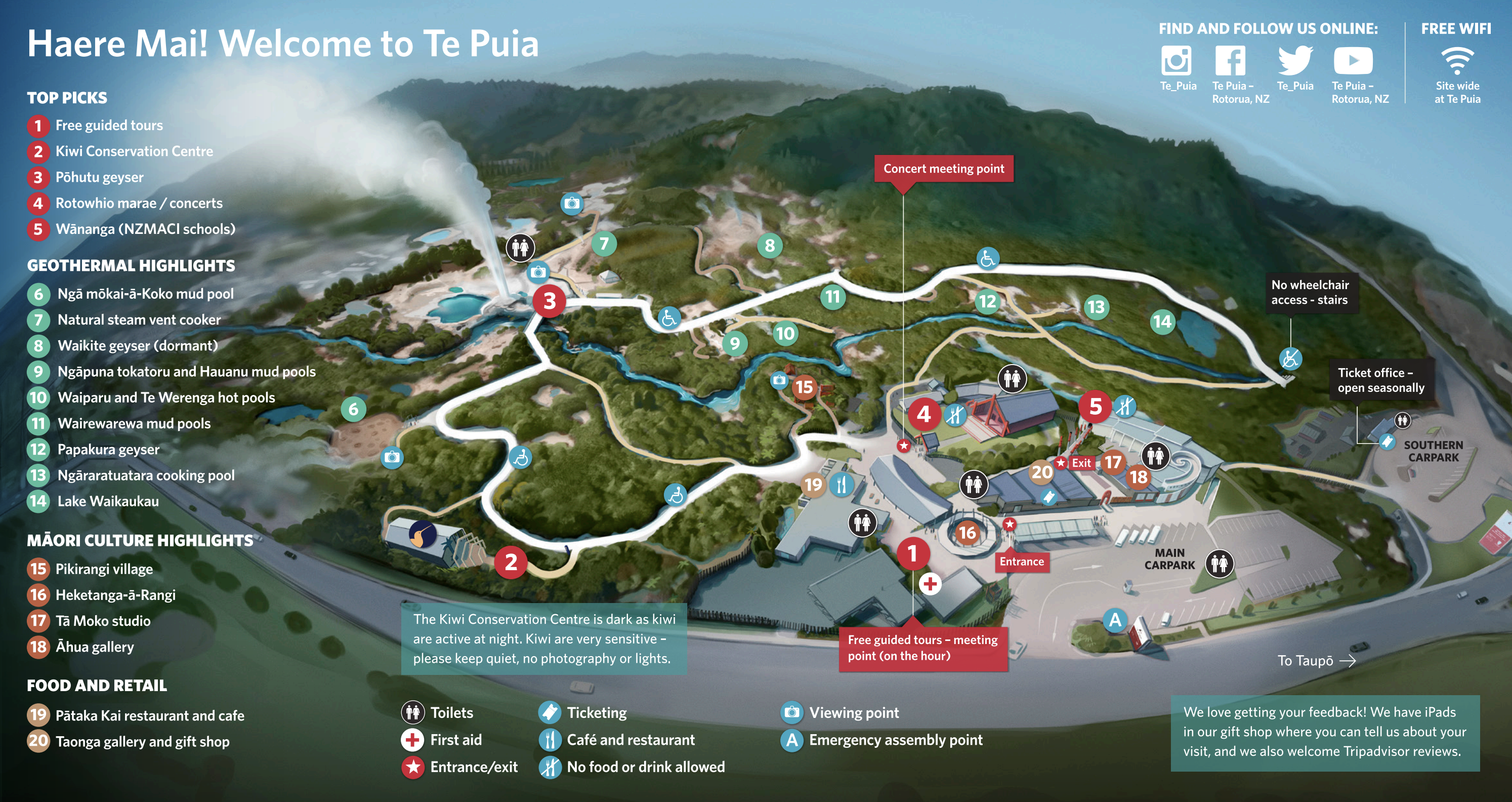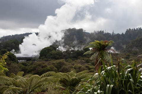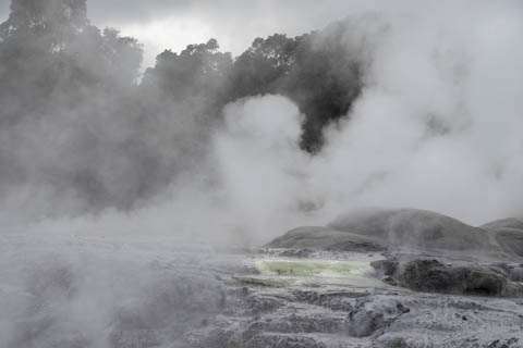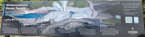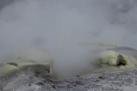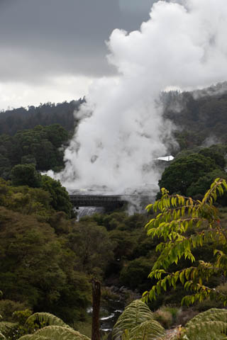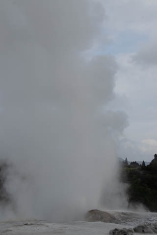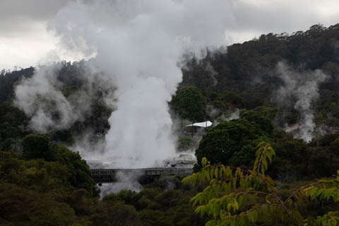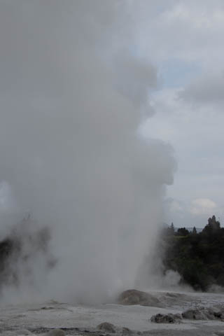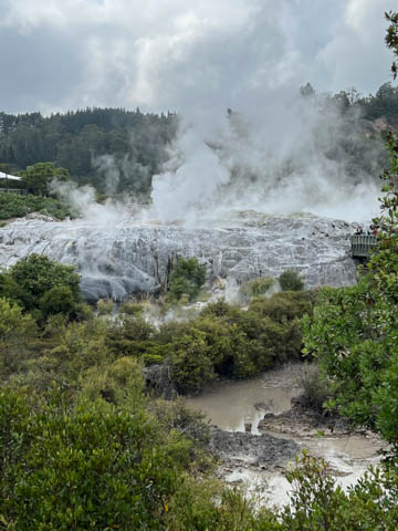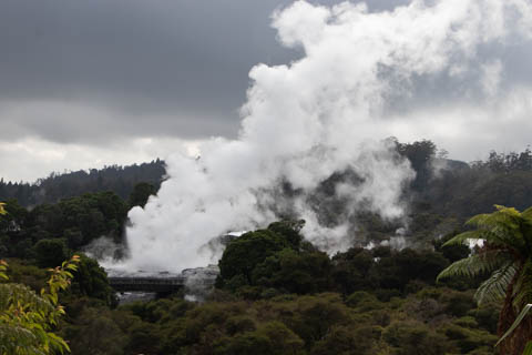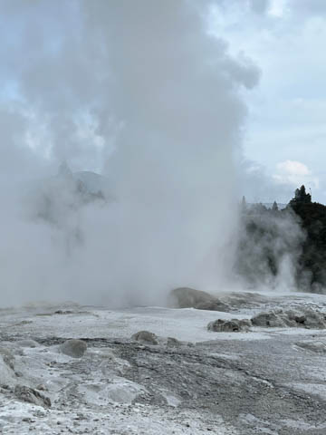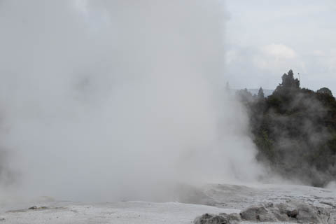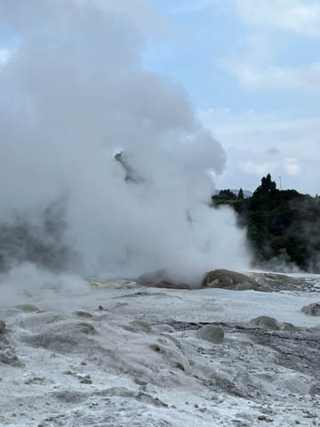 Up top, the most active geyser is the Prince of Wales Feathers / Te Tohu, which erupts frequently. The 7 m tall geyser is similar in shape to the Price of Wales coat of arms, and was named after the visit of Prince of Wales Albert in the early 1900s. It erupts as an indicator of the eruption of Pohutu, which erupts to 30 m high, making it the largest geyser in the Southern Hemisphere and earning its name which means "big splash."