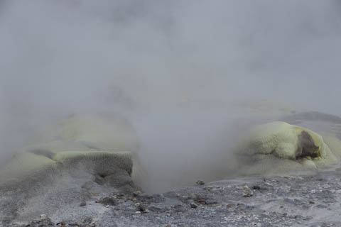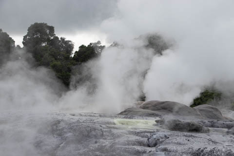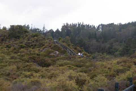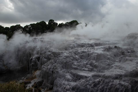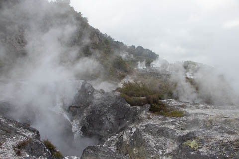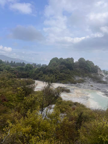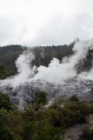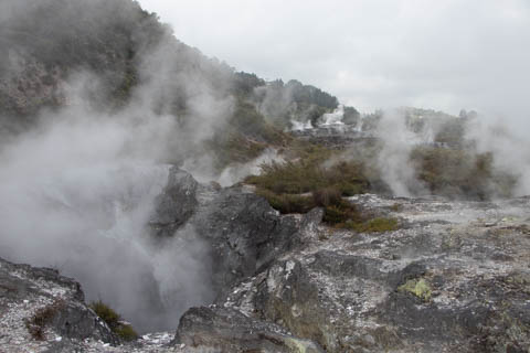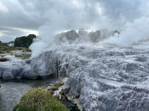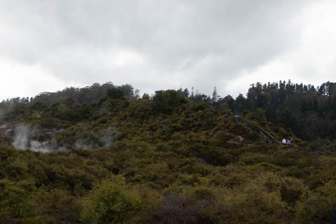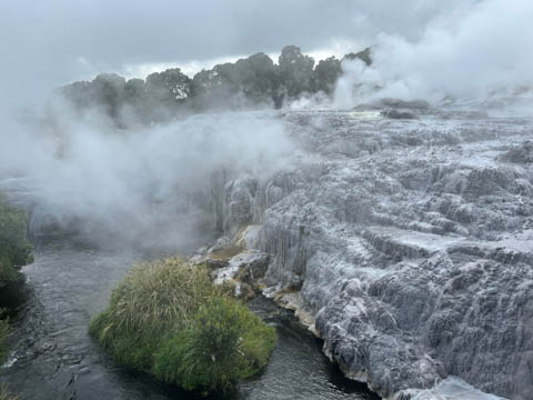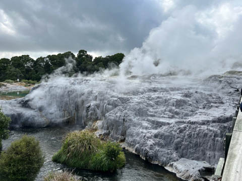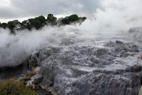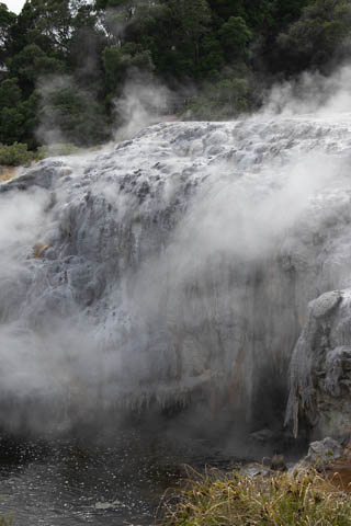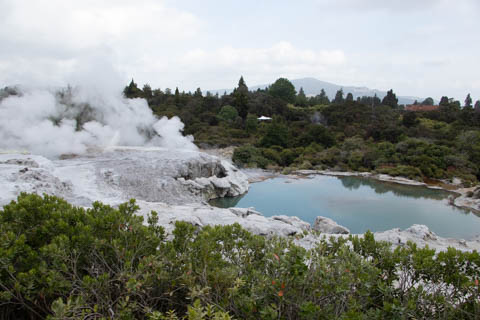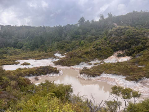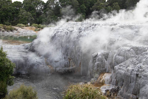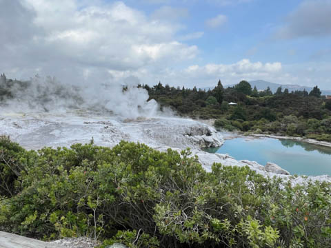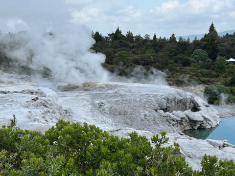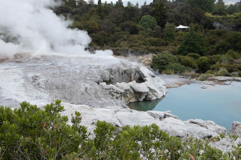 Our guide then led us around a small trail leading to some overlooks of the geyser terrace area. There are six geysers in a small area. On the lower, left side of the terrace is the Kereru geyser, also known as the Wood Pigeon geyser. The small river empties into a blue pool, which is naturally heated and a place the local Maori still enjoy.
