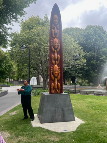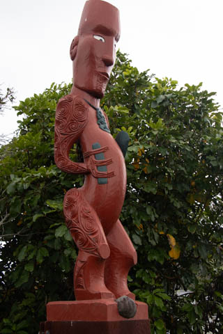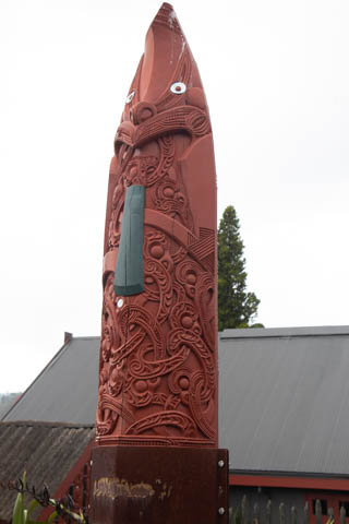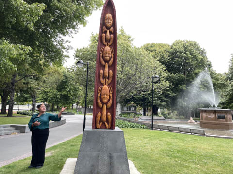 Here is the Poo Pou Monument which was erected in 1994. This is a six-meter tall decoratively carved statue that commemorates the 19th century signing of the Tready of Waitangi between the Crown and local Maori chefs. The carving is a decorative piece of work representing Mahinga Kai (food source) and Tipuna (ancestors) of the Ngāi Tahu-Waitaha people.