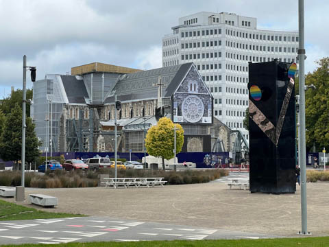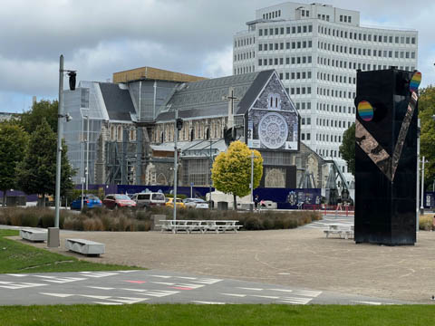 This is Christchurch cathedral, which is still undergoing extensive renovations after the earthquake with renovation beginning in 2020. The bell tower and stained glass main window both collapsed, with the building suffering extensive structural damage.