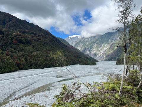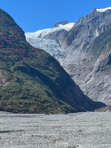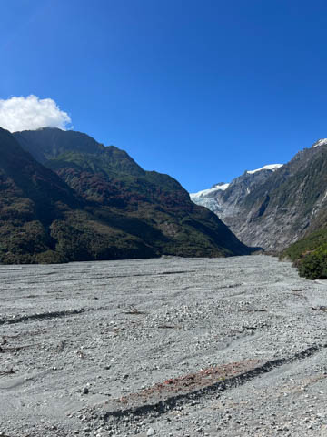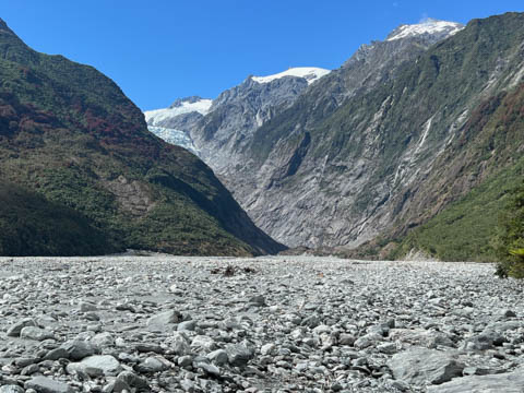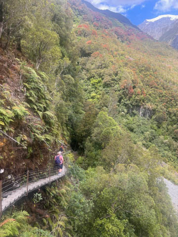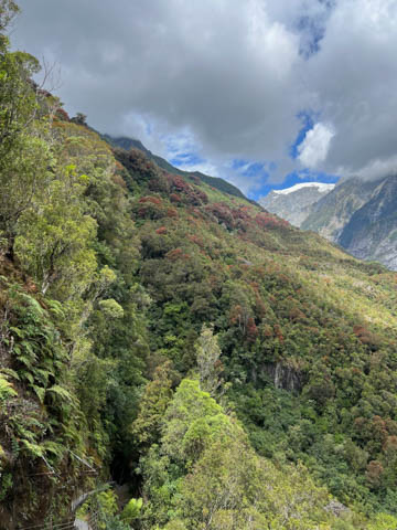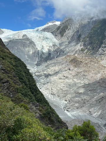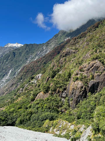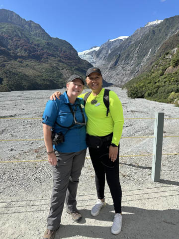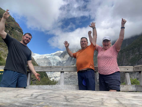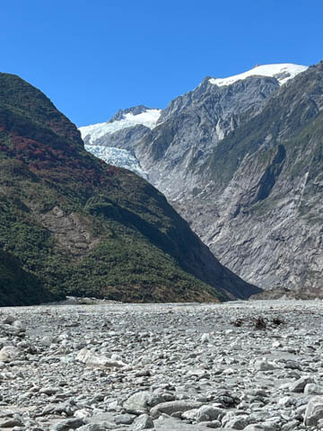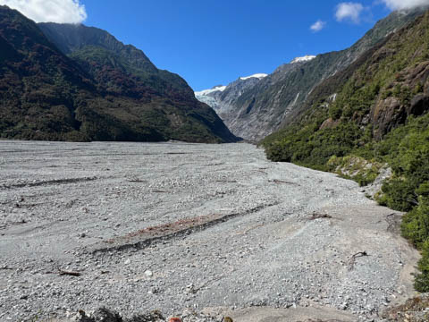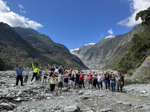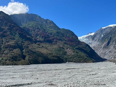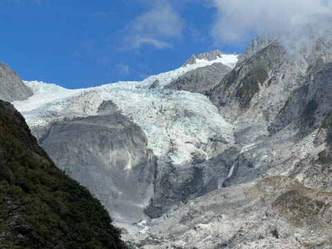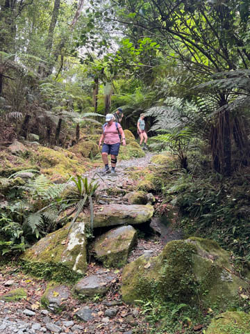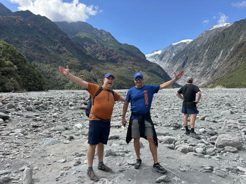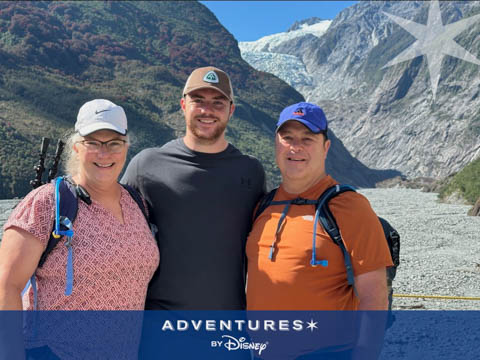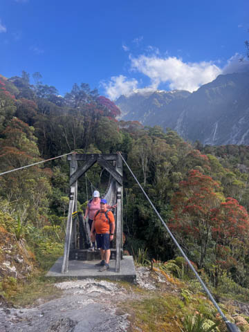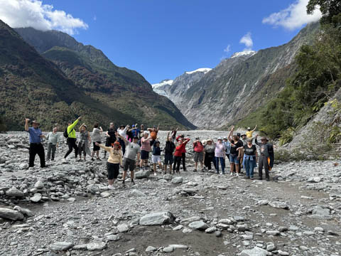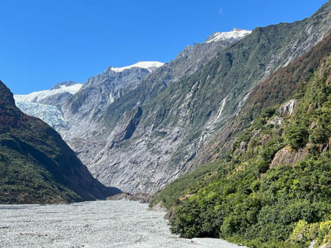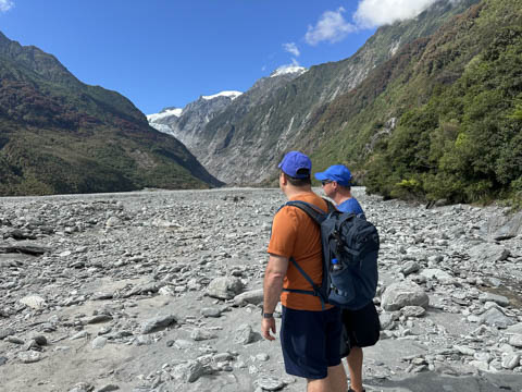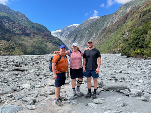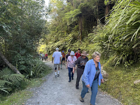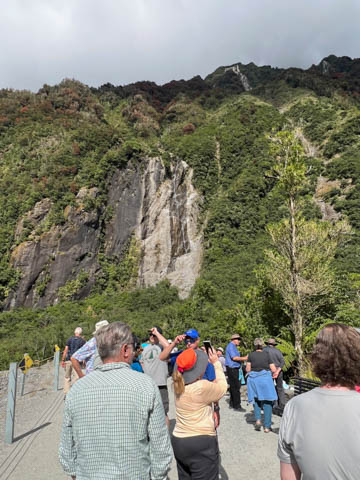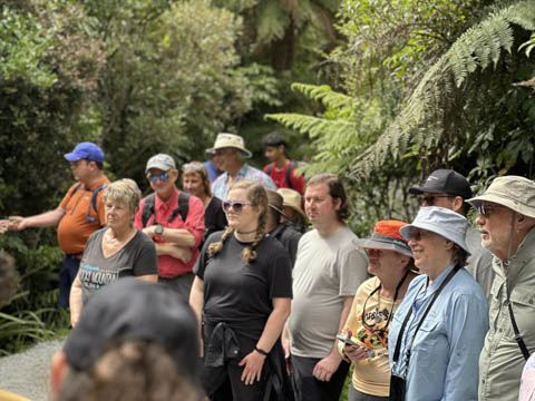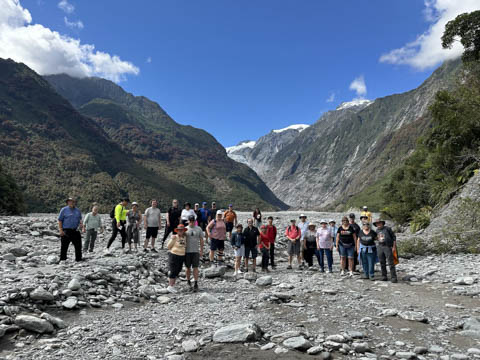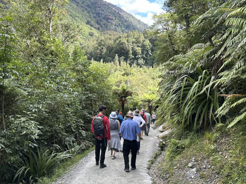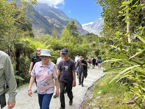 January 2025 (Part 10) New Zealand Trip - Day Nine: Franz Josef Adventures By Disney - Day Eight: Franz and Family As a group, we headed up into Westland Tai Poutini National Park. There we met a guide for a short (and thankfully mostly flat) walk along the Waiho River to an overlook site viewing the Franz Josef Glacier high on the mountainside. Our guide took us off the main trail on a path marked for guides only where she talked about the geology and plants of the rainforest in a valley under the glacier not too long ago.