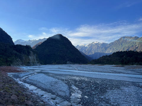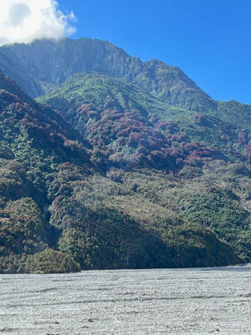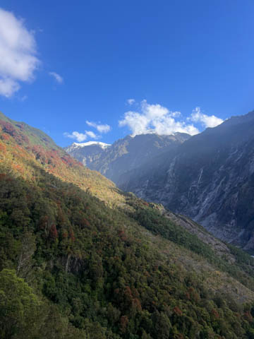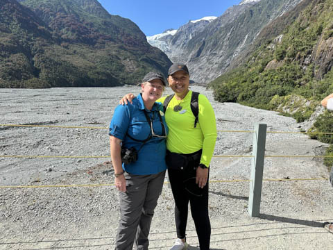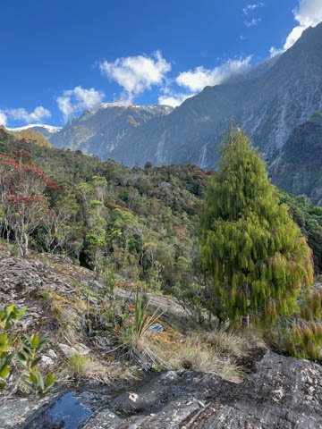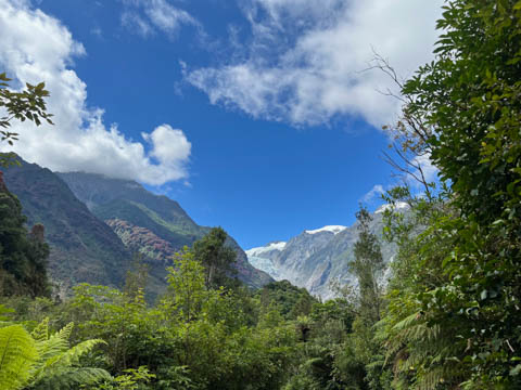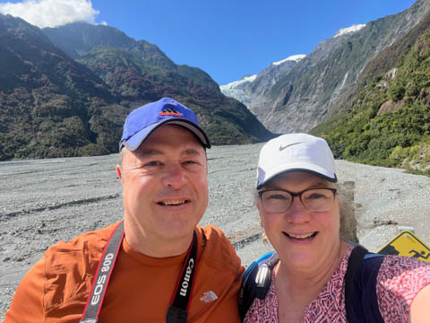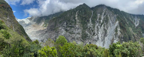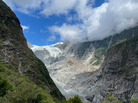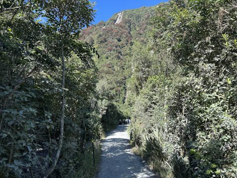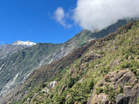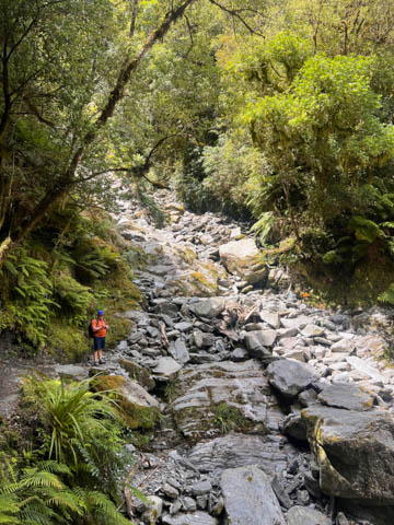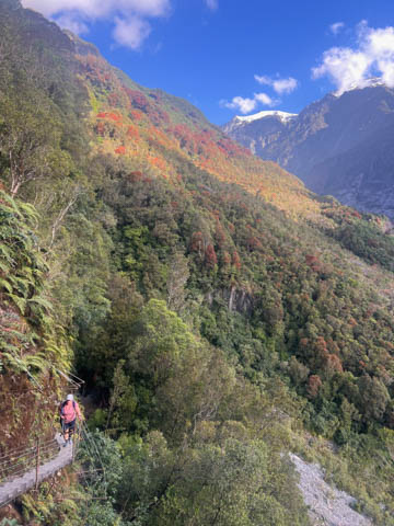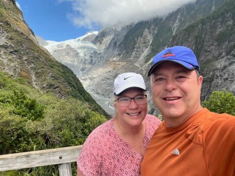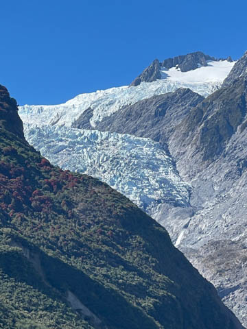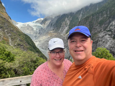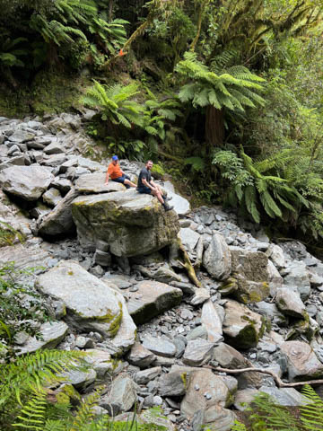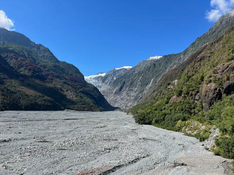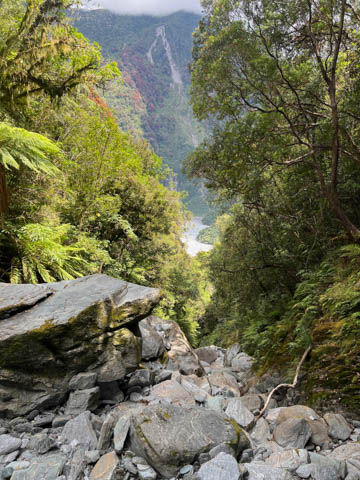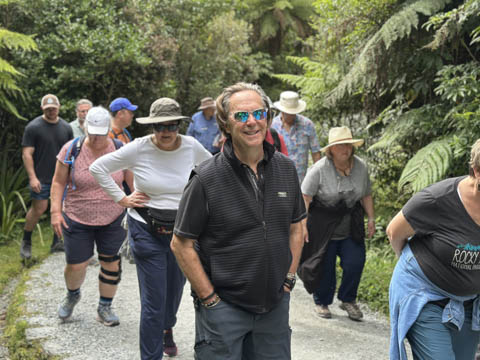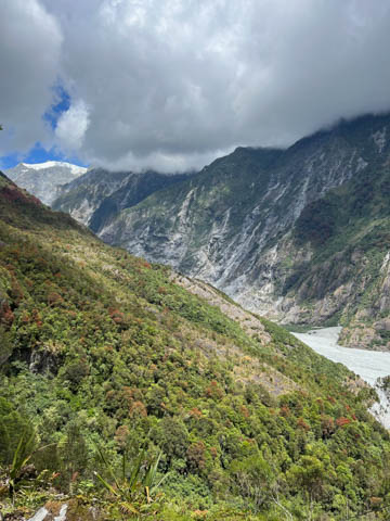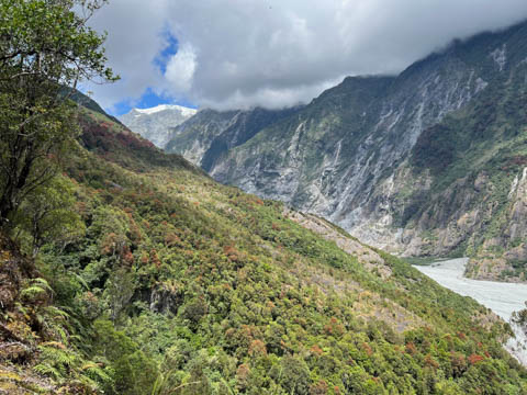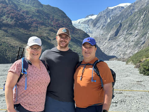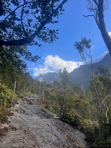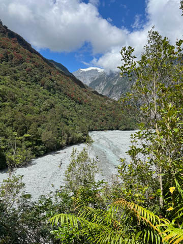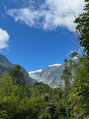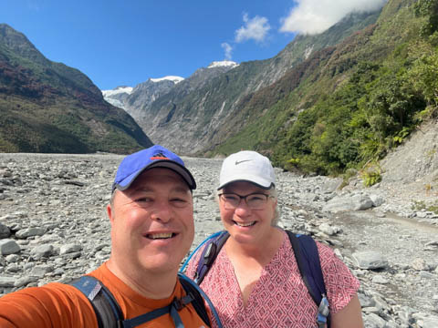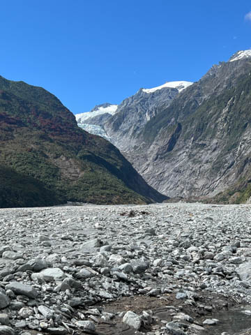 January 2025 (Part 10) New Zealand Trip - Day Nine: Franz Josef Adventures By Disney - Day Eight: Franz and Family As a group, we headed up into Westland Tai Poutini National Park. There we met a guide for a short (and thankfully mostly flat) walk along the Waiho River to an overlook site viewing the Franz Josef Glacier high on the mountainside. Our guide took us off the main trail on a path marked for guides only where she talked about the geology and plants of the rainforest in a valley under the glacier not too long ago.