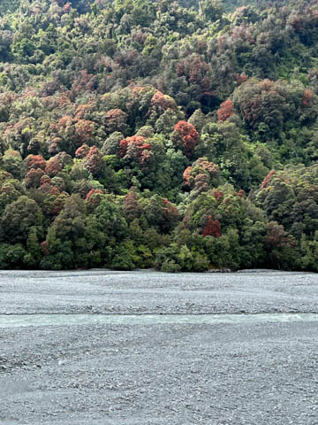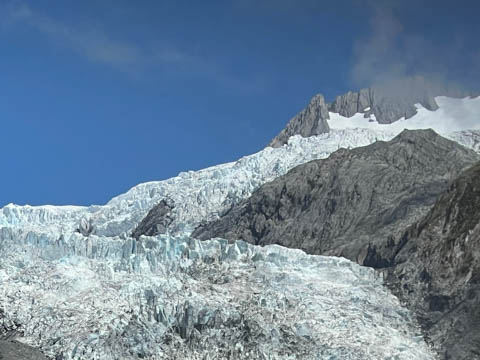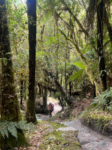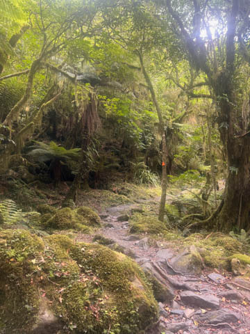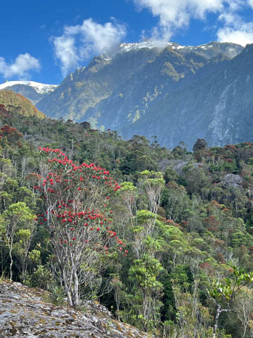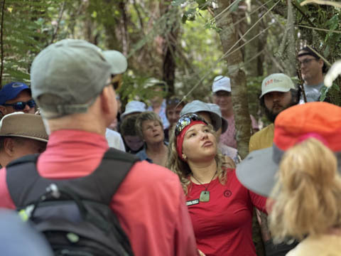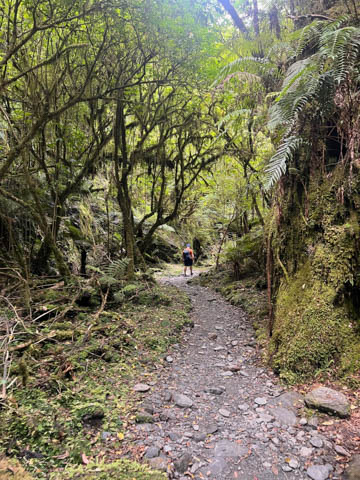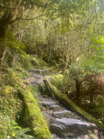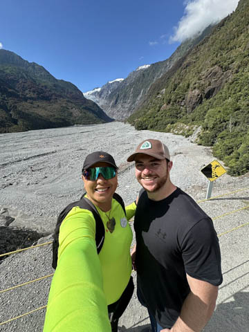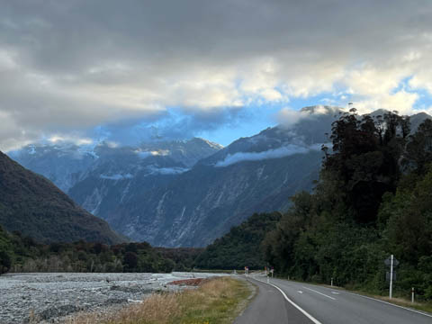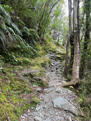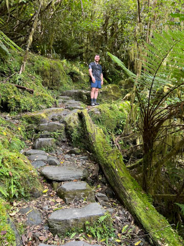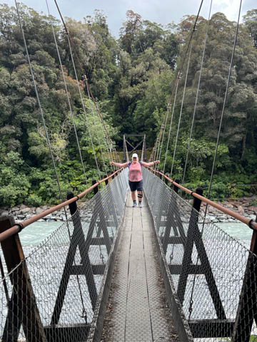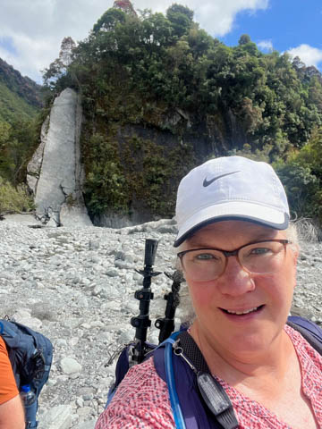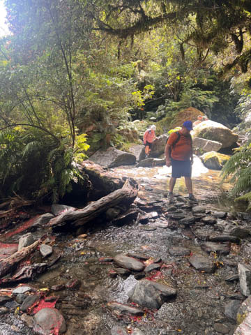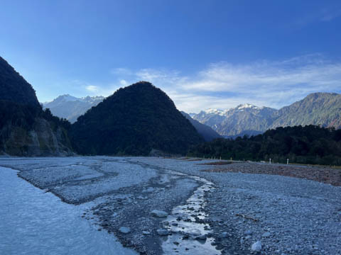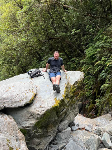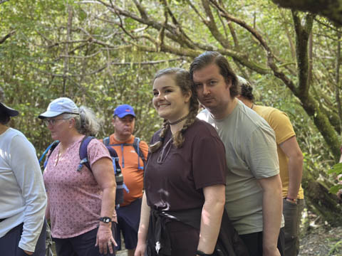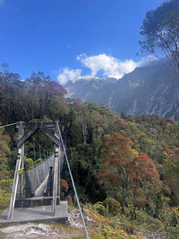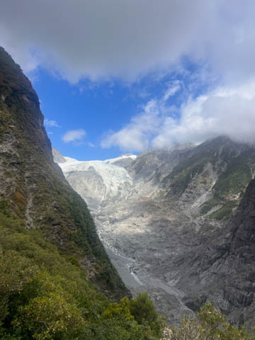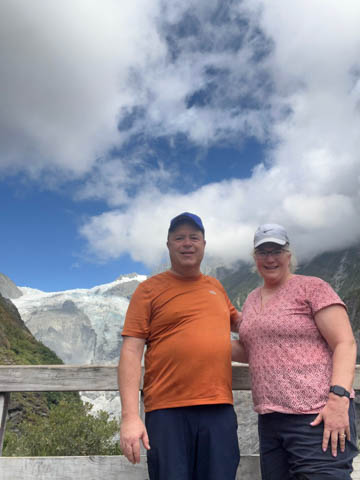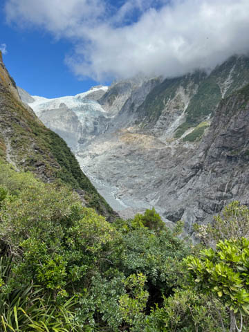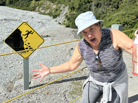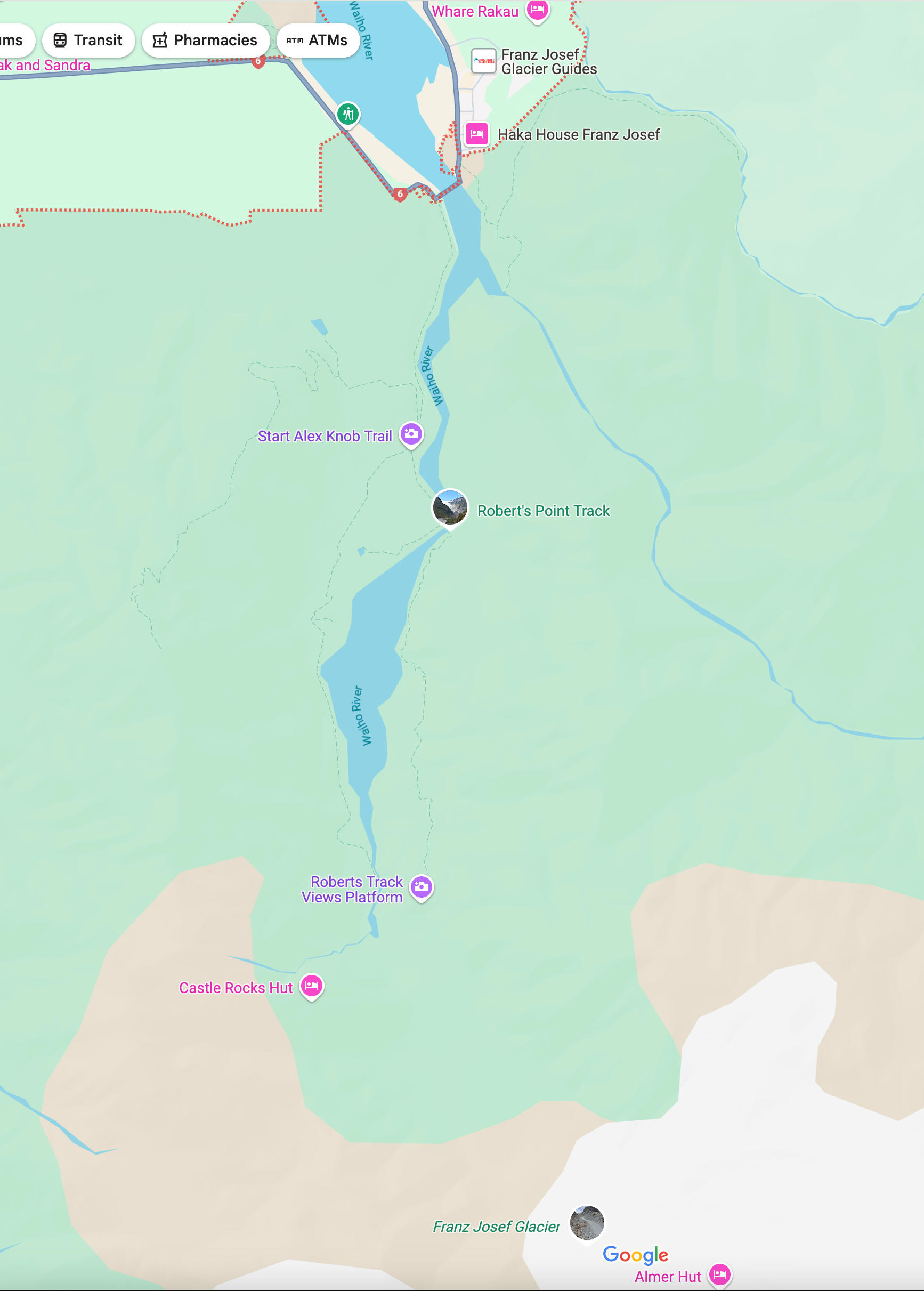 January 2025 (Part 10) New Zealand Trip - Day Nine: Franz Josef Adventures By Disney - Day Eight: Franz and Family As a group, we headed up into Westland Tai Poutini National Park. There we met a guide for a short (and thankfully mostly flat) walk along the Waiho River to an overlook site viewing the Franz Josef Glacier high on the mountainside. Our guide took us off the main trail on a path marked for guides only where she talked about the geology and plants of the rainforest in a valley under the glacier not too long ago.