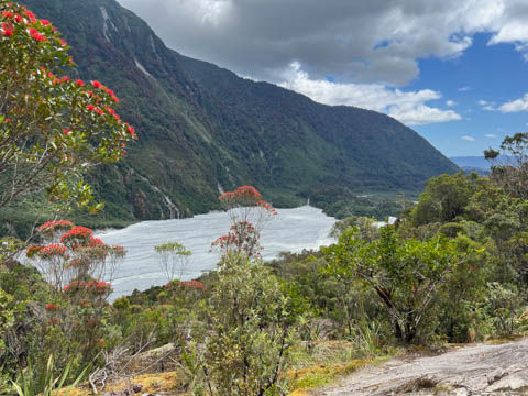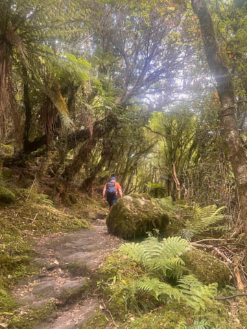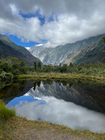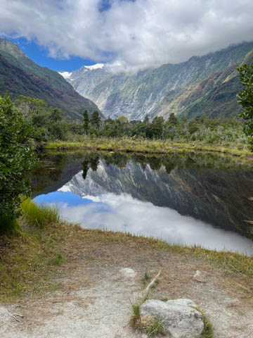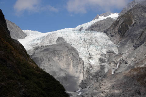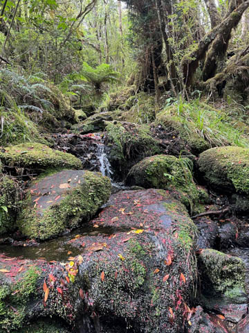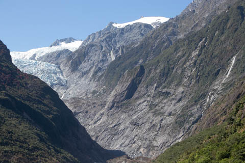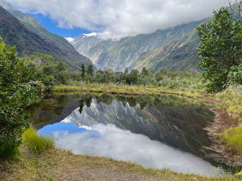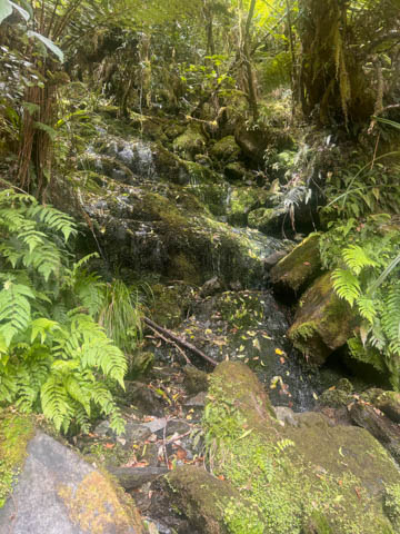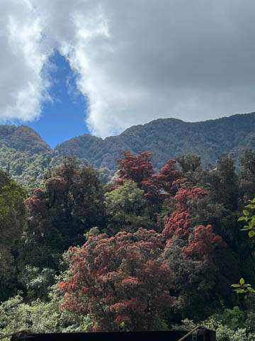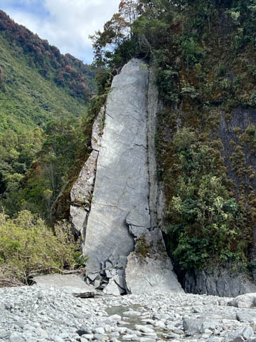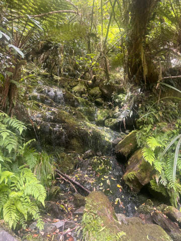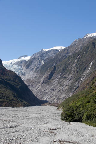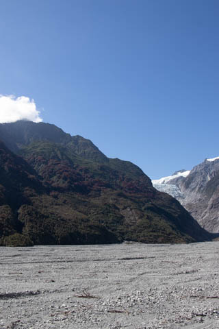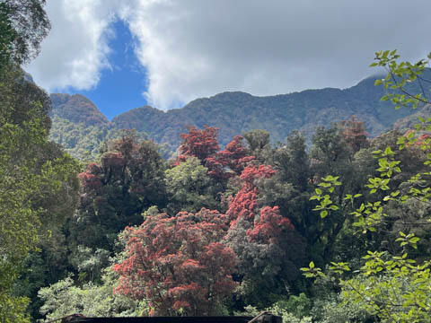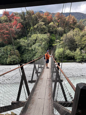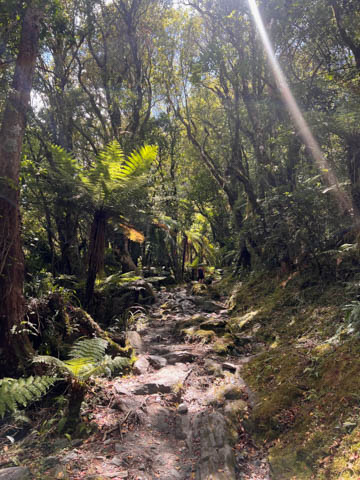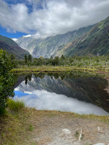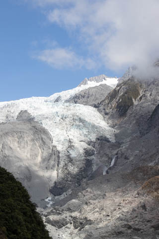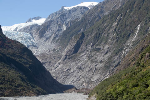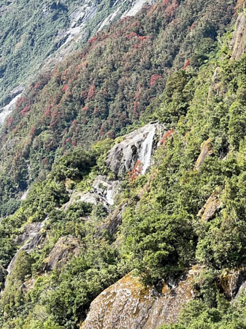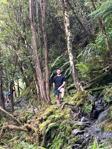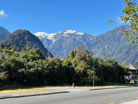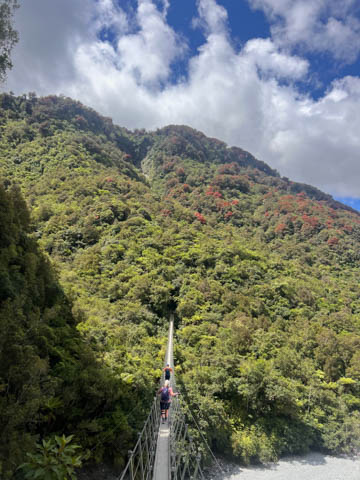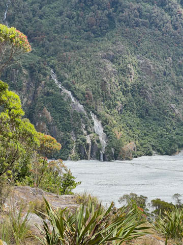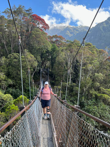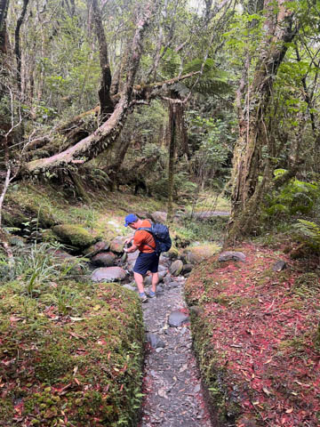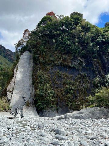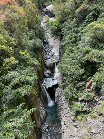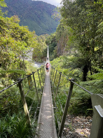January 2025 (Part 10) New Zealand Trip - Day Nine: Franz Josef Adventures By Disney - Day Eight: Franz and Family As a group, we headed up into Westland Tai Poutini National Park. There we met a guide for a short (and thankfully mostly flat) walk along the Waiho River to an overlook site viewing the Franz Josef Glacier high on the mountainside. Our guide took us off the main trail on a path marked for guides only where she talked about the geology and plants of the rainforest in a valley under the glacier not too long ago.