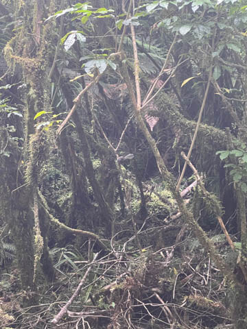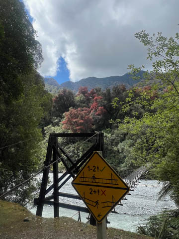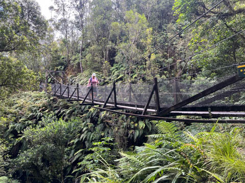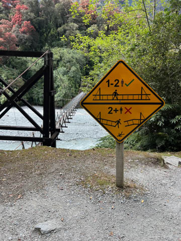 The path led to a small suspension bridge over the river, with supports underneath to prevent it from swaying too much. The path would lead uphill from there, and this quickly became "the hike" also known as a slog, forced march, and grueling adventure. Loved the signs again for the maximum people on a bridge at once.