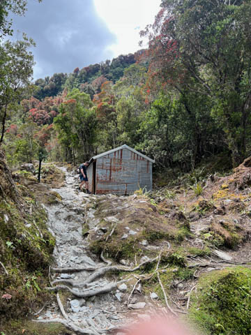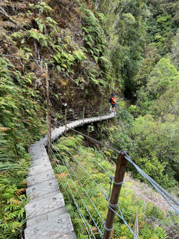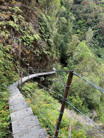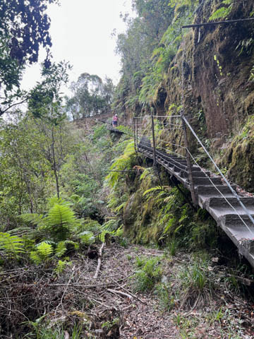 There were several via ferrata-type sections with scaffolds and walkways supported by iron bars set into steep rock faces. Once we reached Hende's Hut, there was a really long section leading down the cliff face.