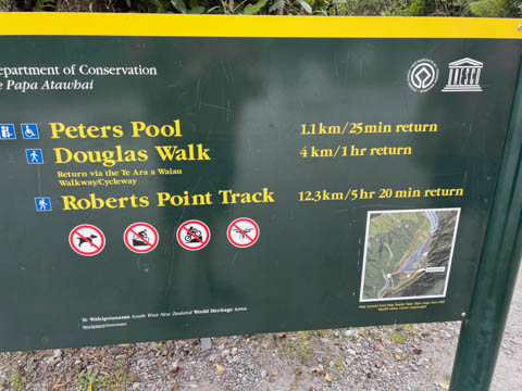 When we got back to the parking lot, we separated from the group. The group was headed back to town for lunch then would have free time in the afternoon. We wanted to go for a hike, so were planning to leave from the parking lot to hike Robert's Point Track to an overlook of the glacier on the left side of the valley. We had taken advantage of the breakfast buffet to make peanut butter and jelly sandwiches, while also grabbing some fruit and a couple granola bars for the trip. The trail began easily enough, a paved route down and across the valley passing a small and picturesque lake.