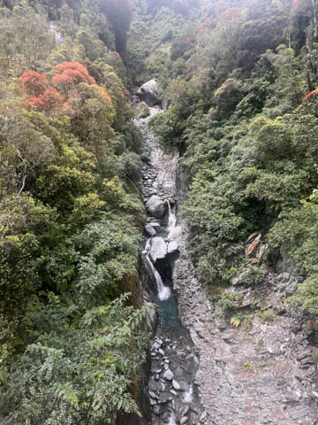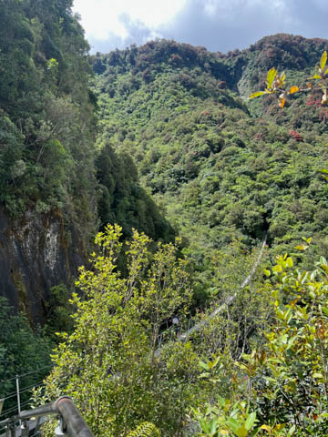 Here is an amazingly long suspension bridge over a gorge. I think this was the fourth bridge at this point. Glad to see they had strung several guide wires from the sides to prevent it swaying too much.