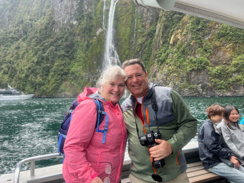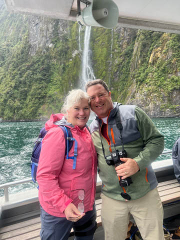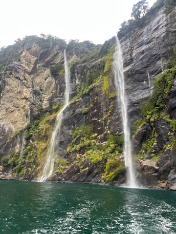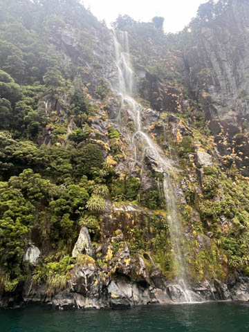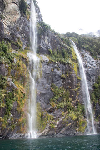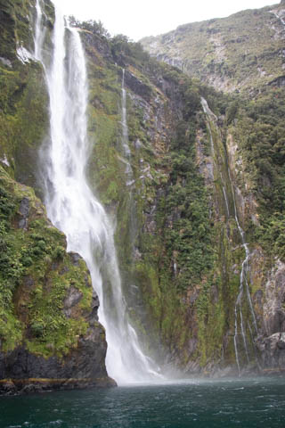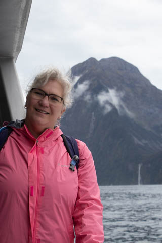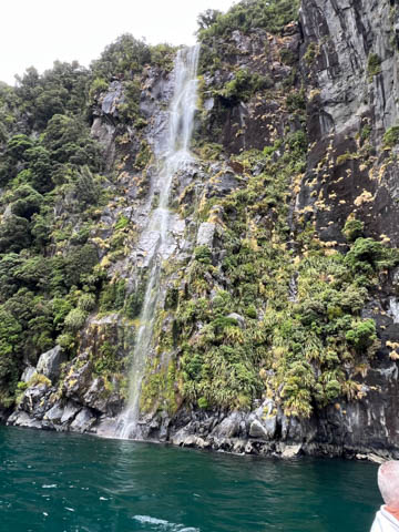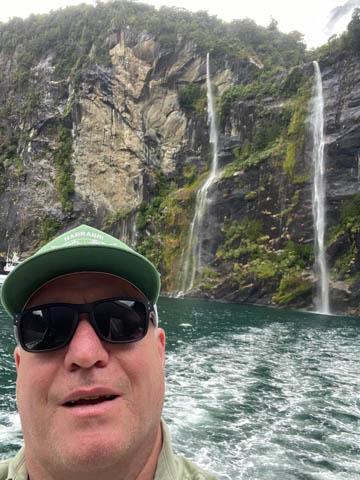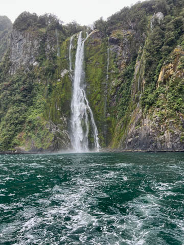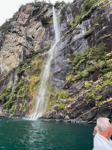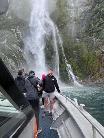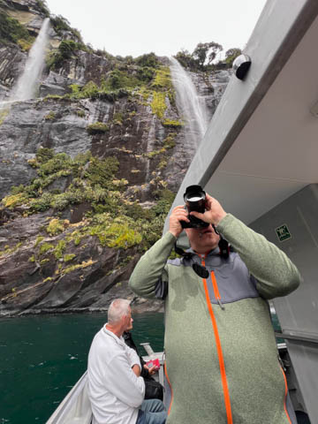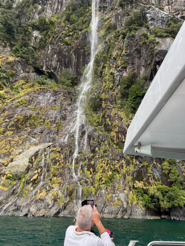 Back at Stirling Falls on the north side, the pilot got the bow of the boat really close to the waterfall, so Andy hurried to the bow to get splashed.