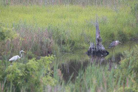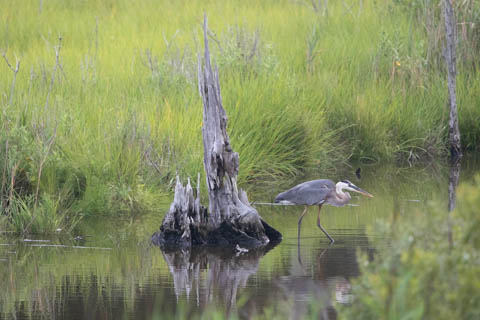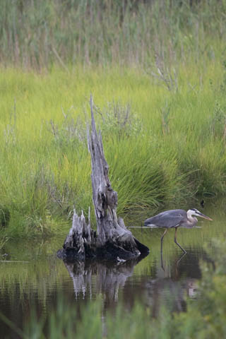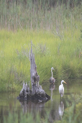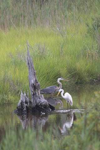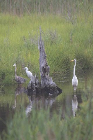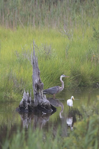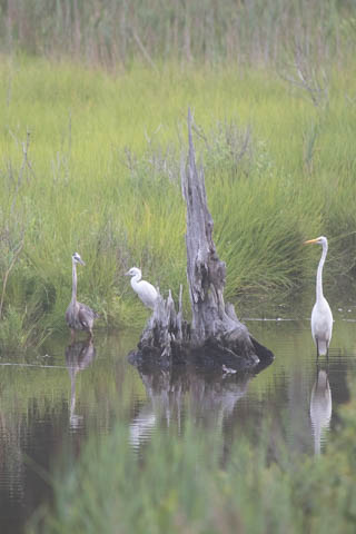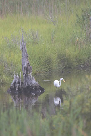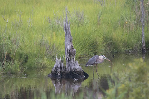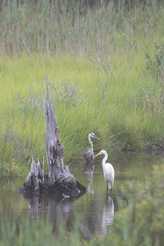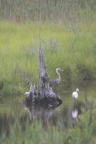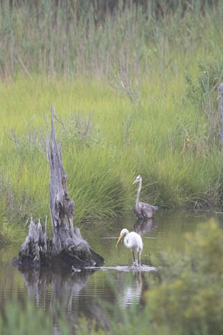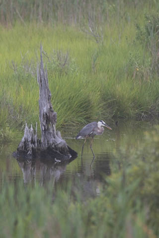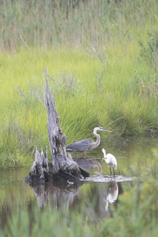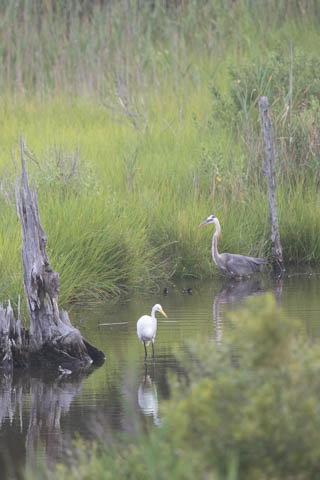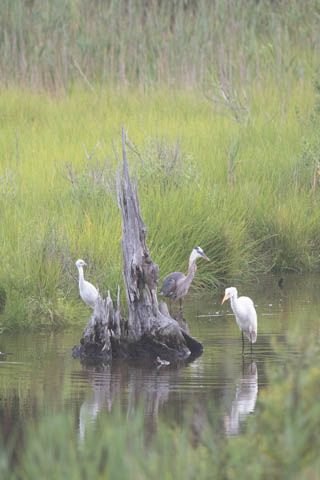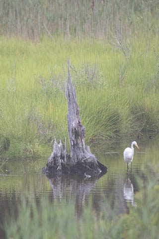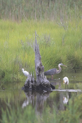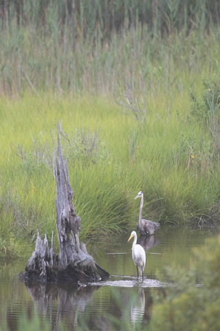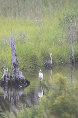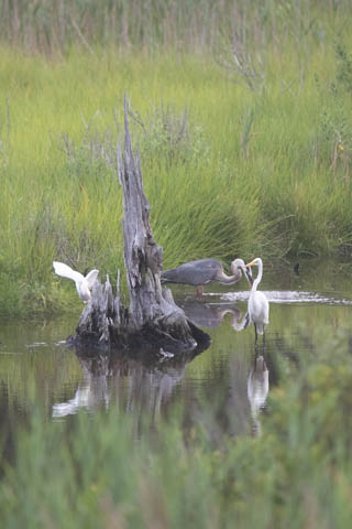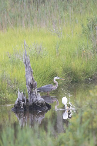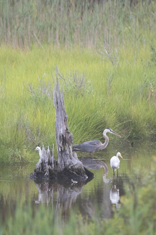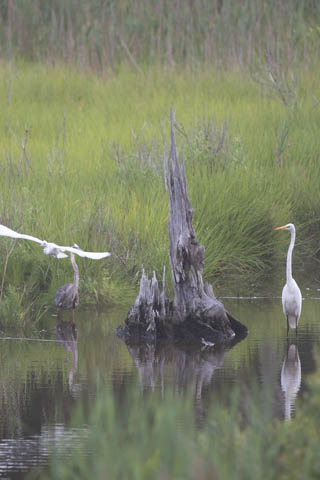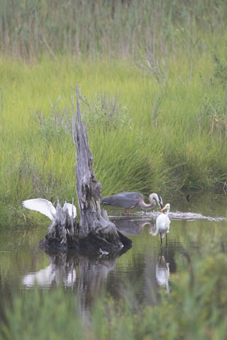 Amazing site early in the morning in July. Saw an egret near this spooky stump in the canal which runs just behind our place and right in front of the deck. Decided to grab the telephoto lens and get some pictures. So two thing immediately happened. The lens fogged up moving from the air conditioning to the super humid outside, and a blue heron landed just behind the egret in the same shot. OK, frantically find a way to clean the lens, clean again, take a couple pictures, clean again and again and hope a couple images come out. Wait, there's something moving behind the stump ... hey, there's another egret, making three herons (egrets are a type of heron, at least they're in the same family). The first egret even caught a fish in the middle of this.
