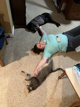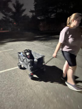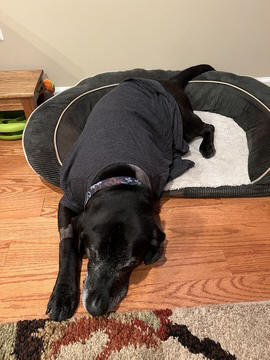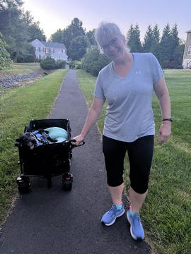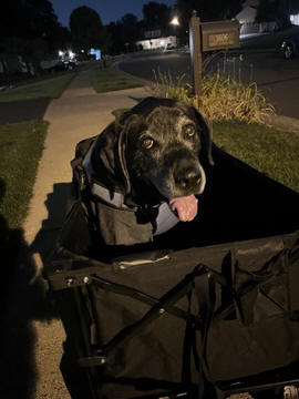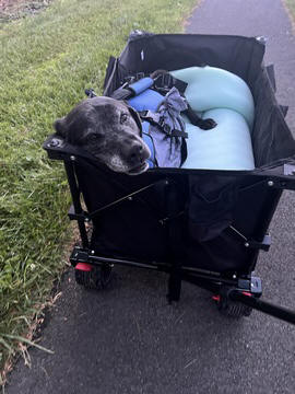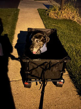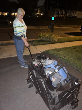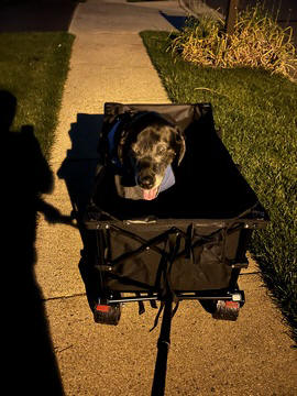 June 2023 (Part 04) Tank As Tank recovers from his surgery to amputate his cancerous leg, we decided he might enjoy a "walk" in a wagon. The first time wasn't so good, as he wouldn't lie down. This time we put a foam cushion inside and helped him lie down. He seemed a lot better on this trip.