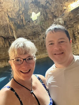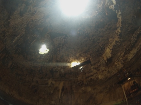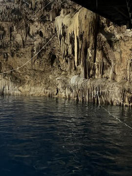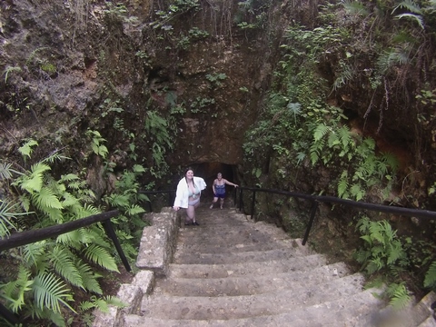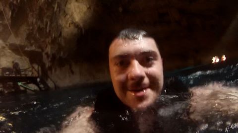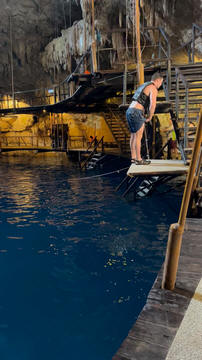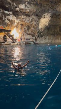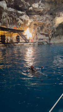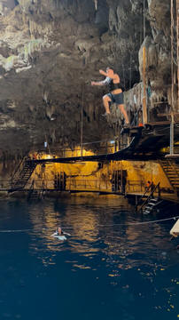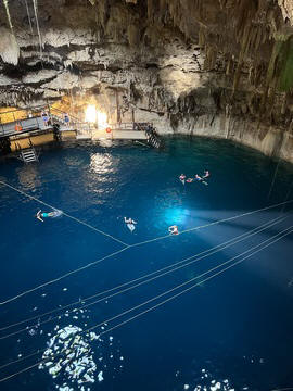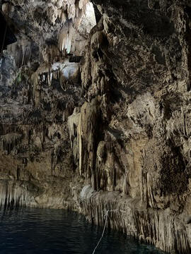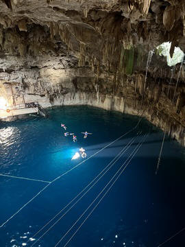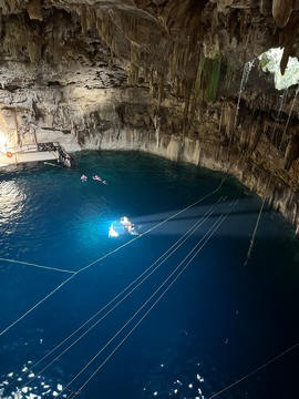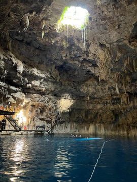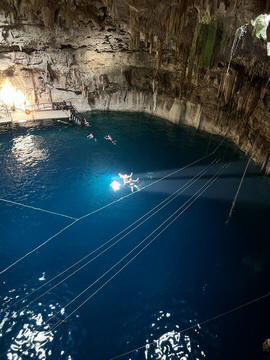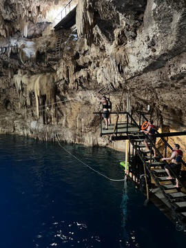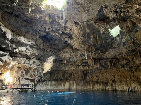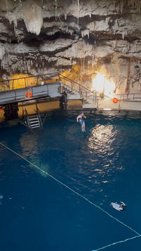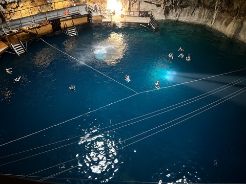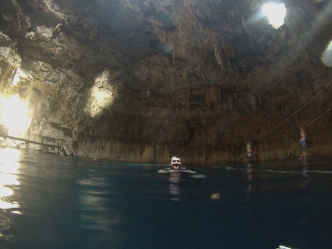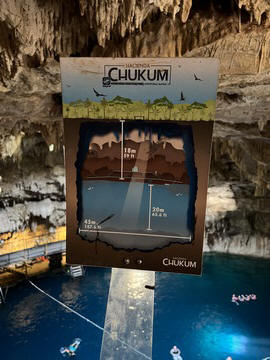 From there we headed to Cenote Chukum. This cenote was leased by the tour company and had several high platforms to jump off and a zip line. The cenote was 45 m (147.6 ft) wide and had 18 m (50 feet) of space between the roof and water, which was 20 m (60.6 ft) deep. Surprisingly, the cenote had small fish, blind species of catfish and other type. The water was also clearly saturated with minerals and smelled slightly sulphuric. Primo noted that the locals who all use cenotes as their primary source of water are susceptible to kidney stones and will frequently use sugar in their water to help neutralize the minerals.