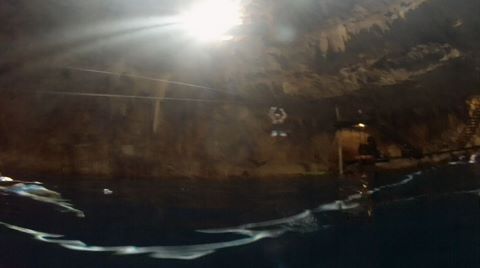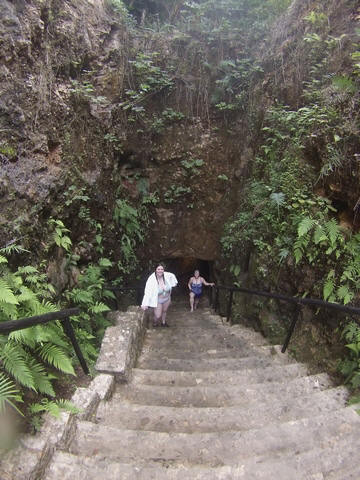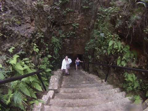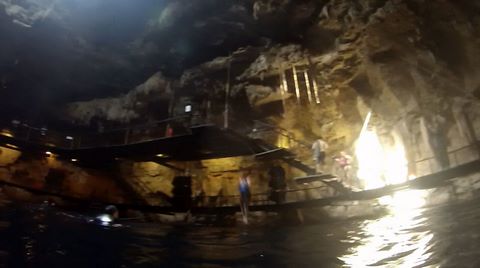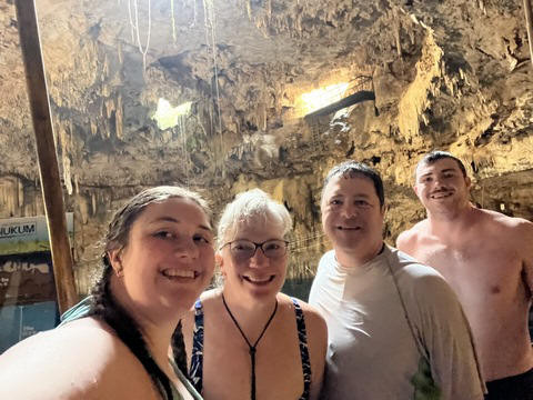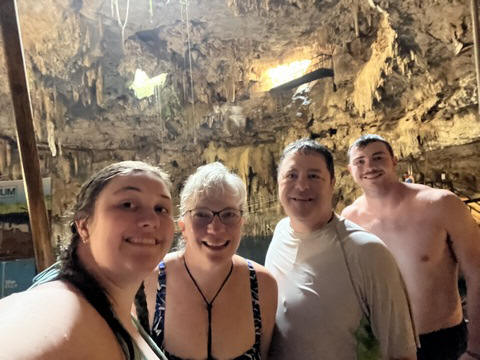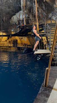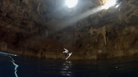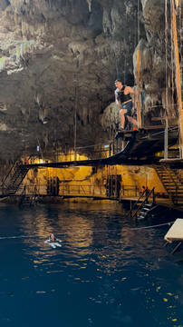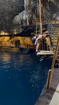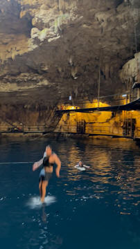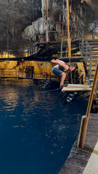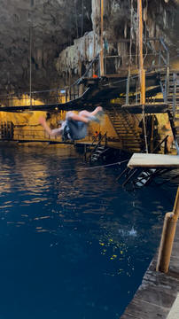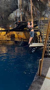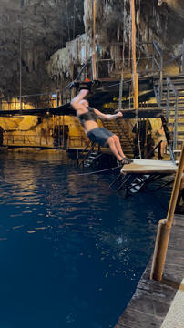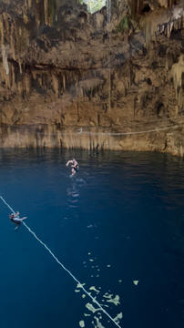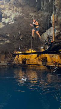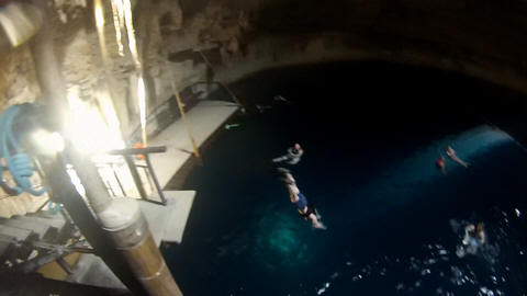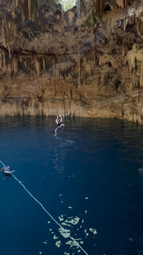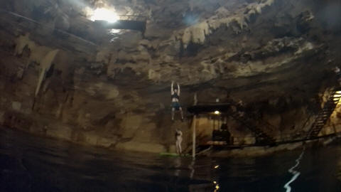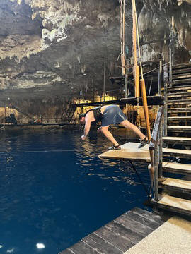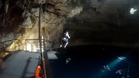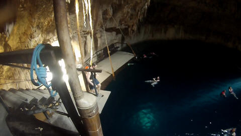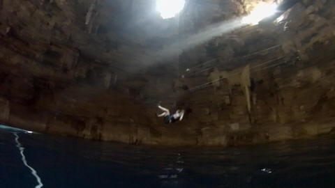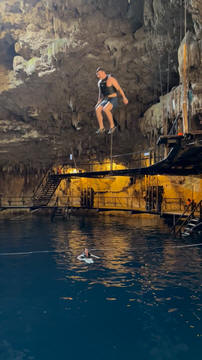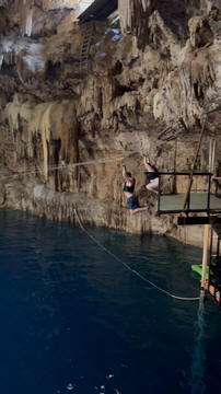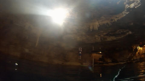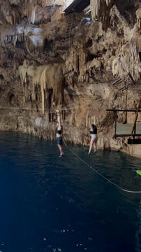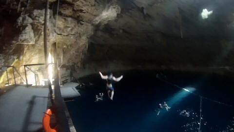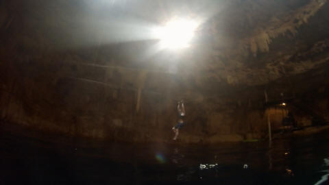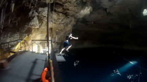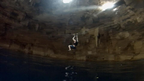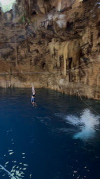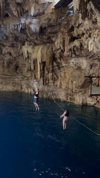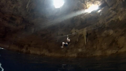 Here are some images at the Cenote clipped from the Nancy's iPhone video. Here is Andy jumping from one of the ledges. Next is Andy and Lexi on the zipline. Lexi fell off pretty quickly. What's funny is seeing Andy try to twist himself around to see here making it look like he's running on top of the water at the end.