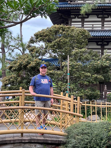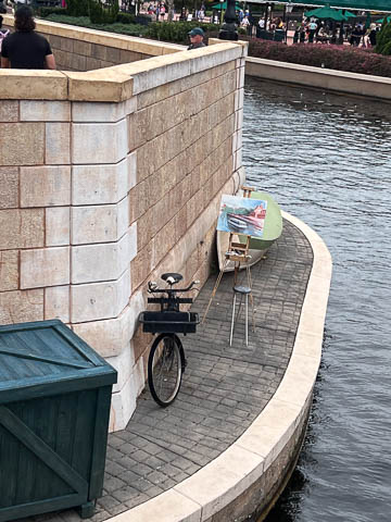 We stopped to get our picture taken on the bridge leading into France. Looking over the side, we continued to marvel at the attention to detail, including this apparent artist spot setting up next to the water. Steve waited a while to get a shot into the France pavilion without someone in the way.