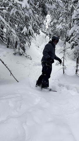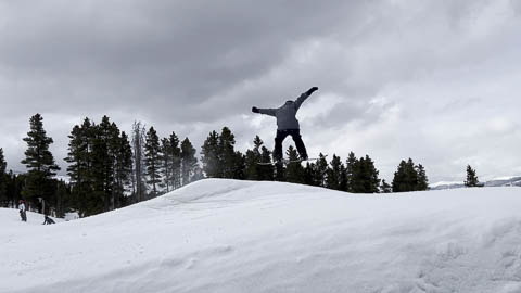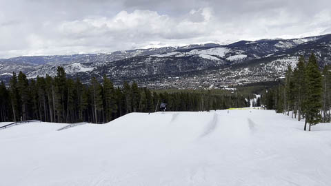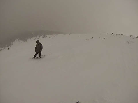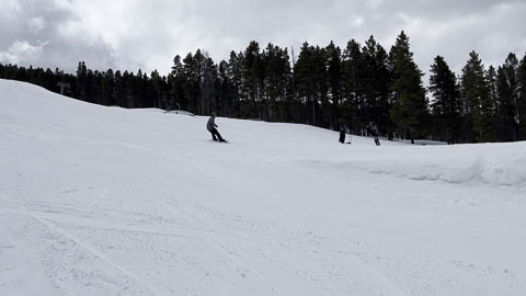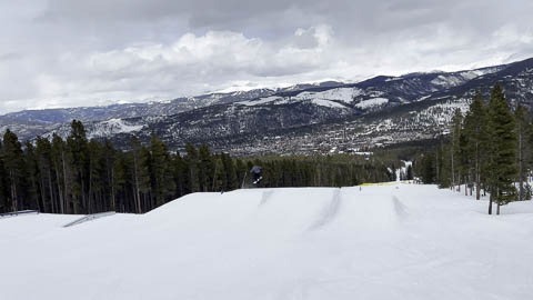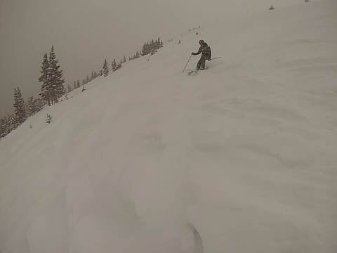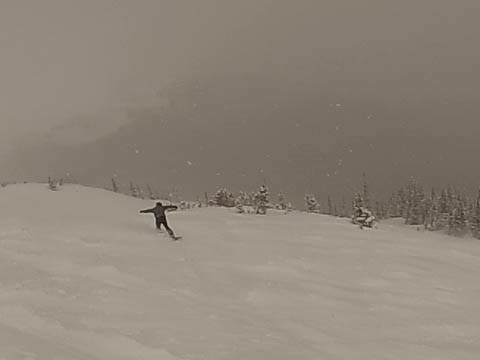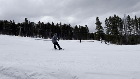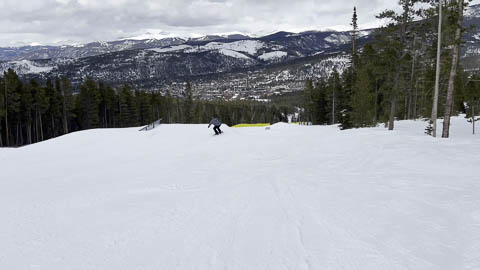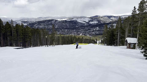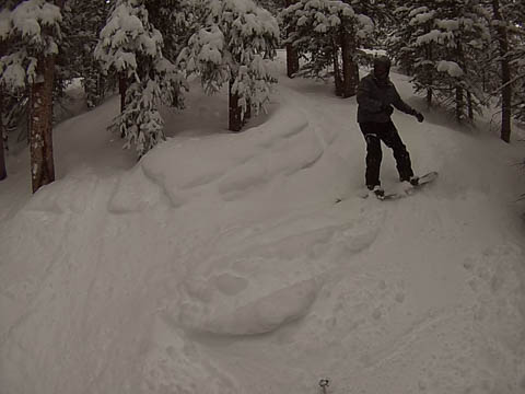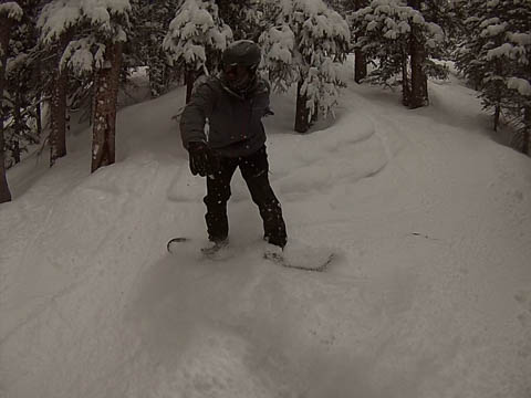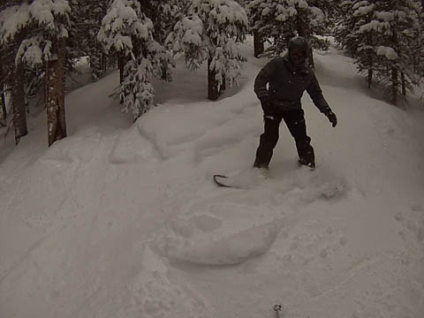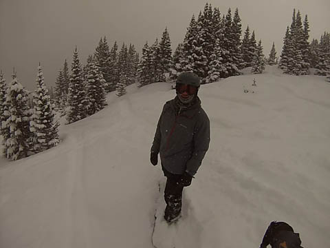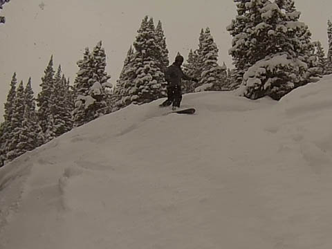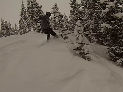 In Breckenridge, we met up with two of Andy's friends from high school. Tyler Thompson, who is now a Lieutenant in the Army stationed at Fort Carson arrived about the same time we did. Kyle Gallagher came in later that evening. The four of us had two great days at Breck, with a partly cloudy sky on the first day, and about 8-10 inches and clouds for Mon. Here are some images clipped from GoPro video from Monday.