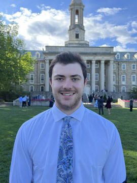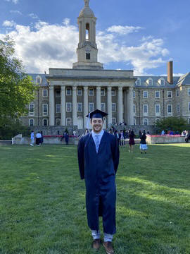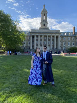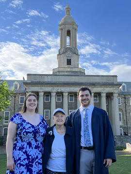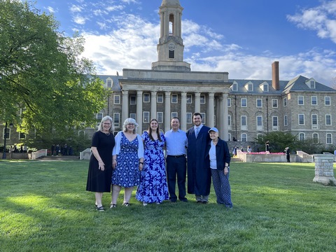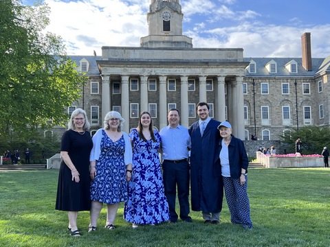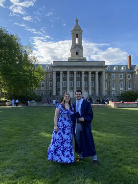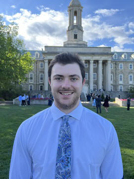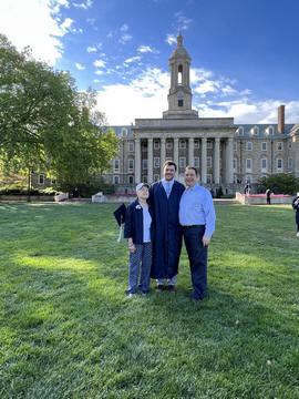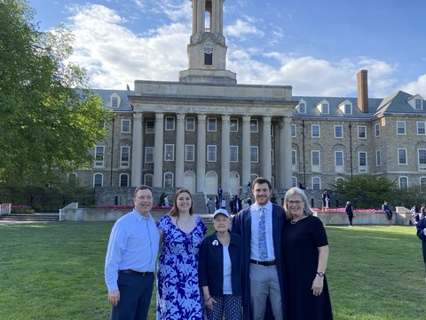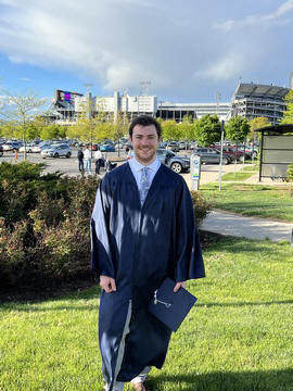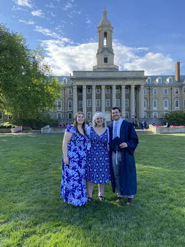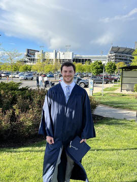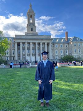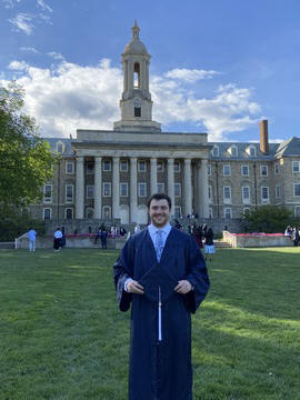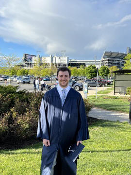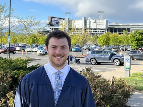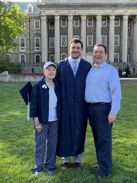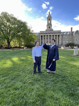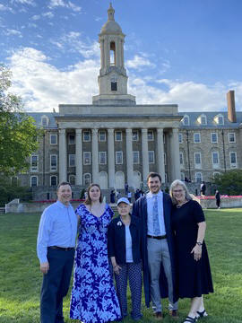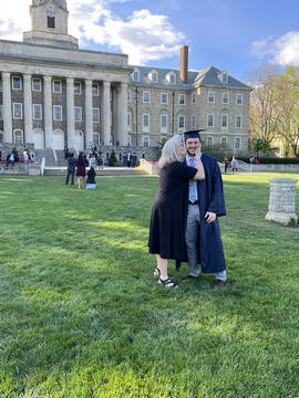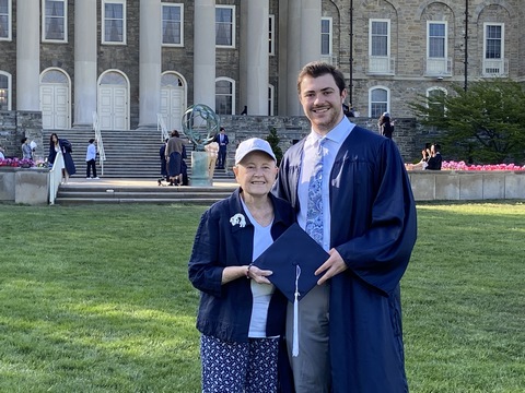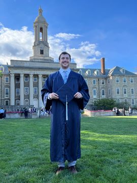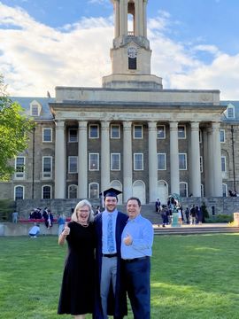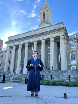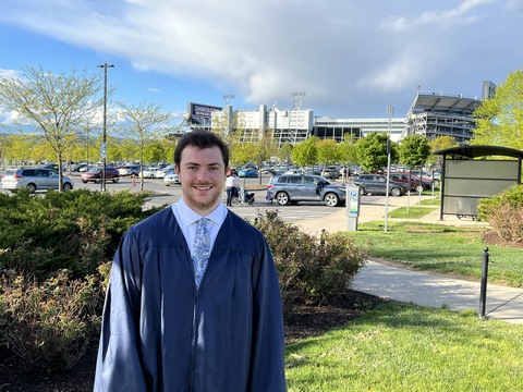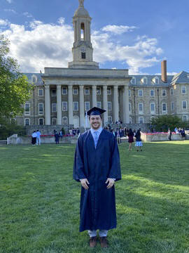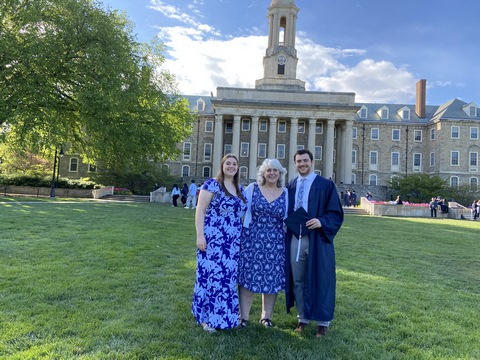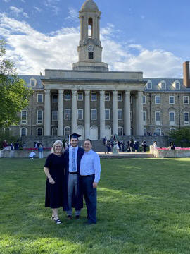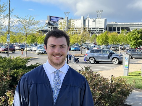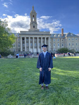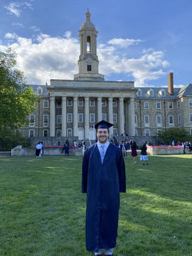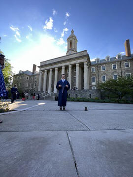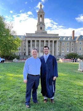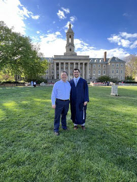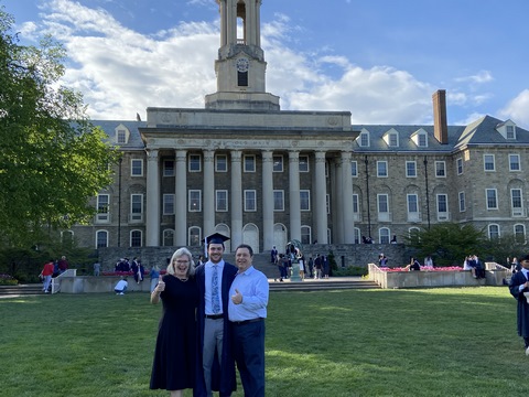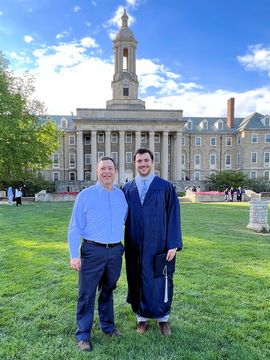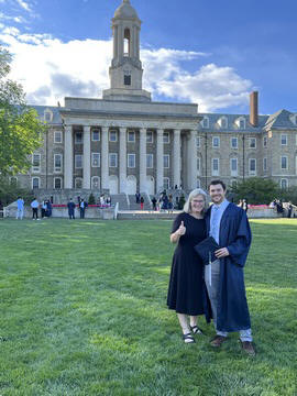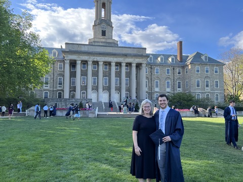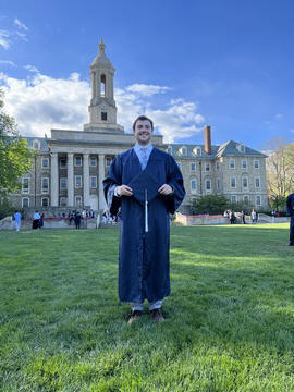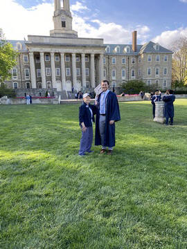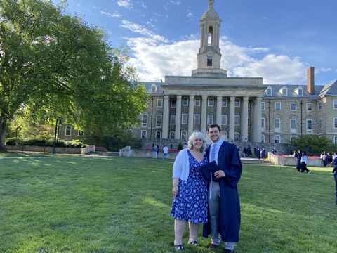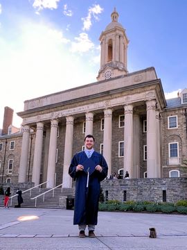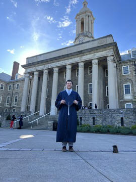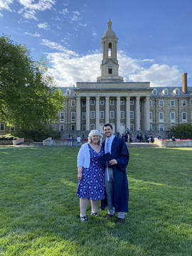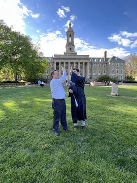May 2023 (Part 01) Andy's Graduation from the Pennsylvania State University Andy graduated on Friday, May 5th. We stopped to take some pictures after dinner and before the ceremony. Here is Andy trying to get his graduation gown steamed, as his earlier ironing wouldn't get rid of the wrinkles.