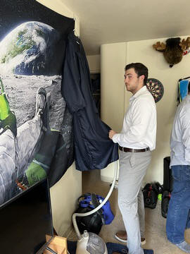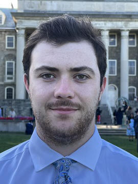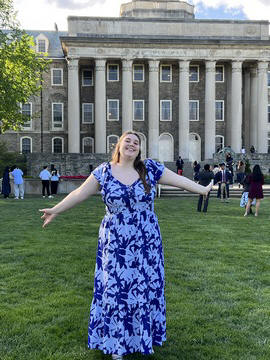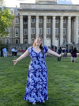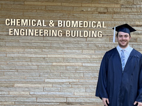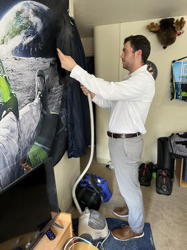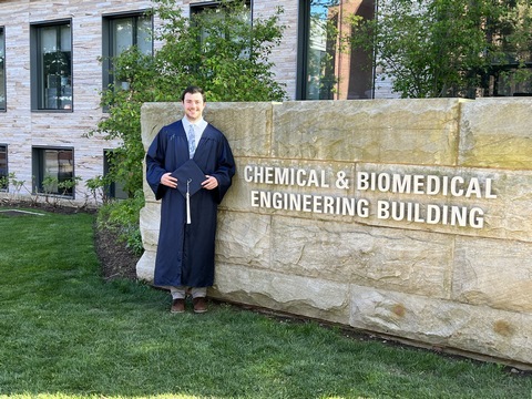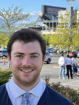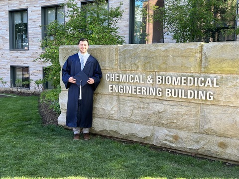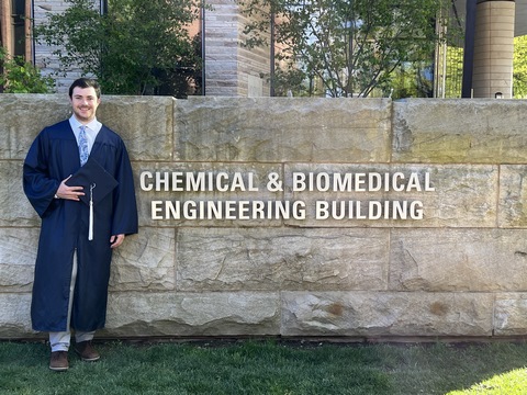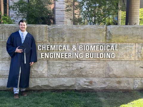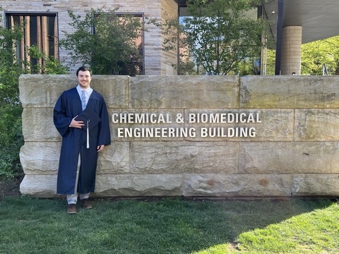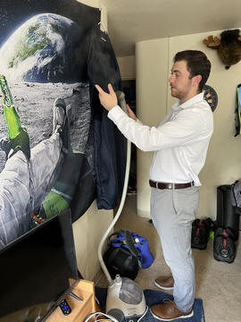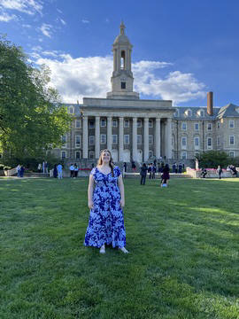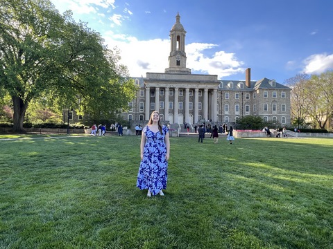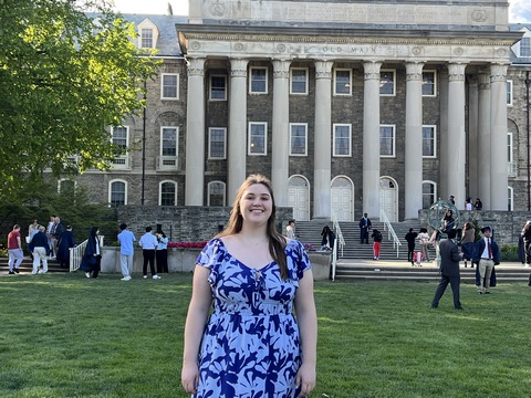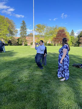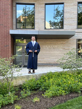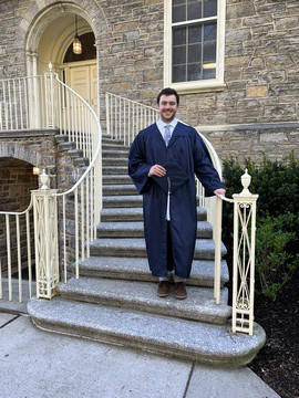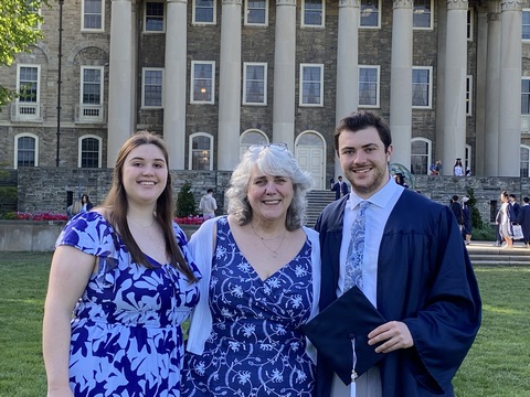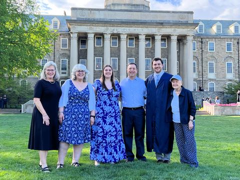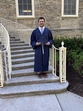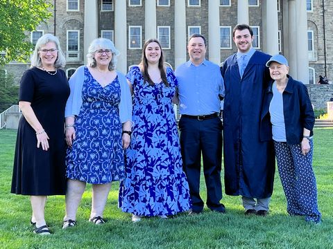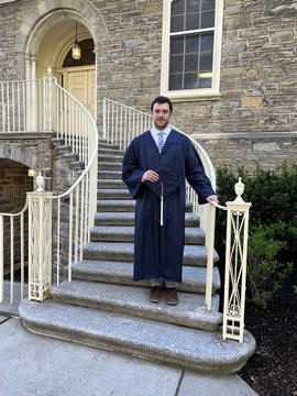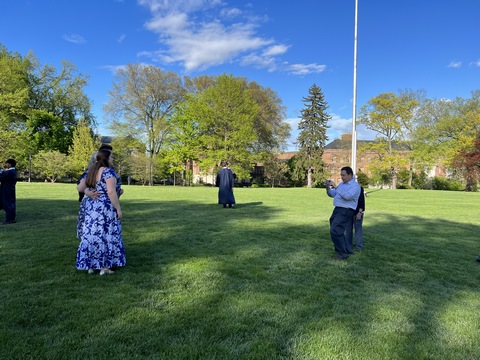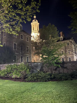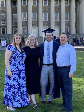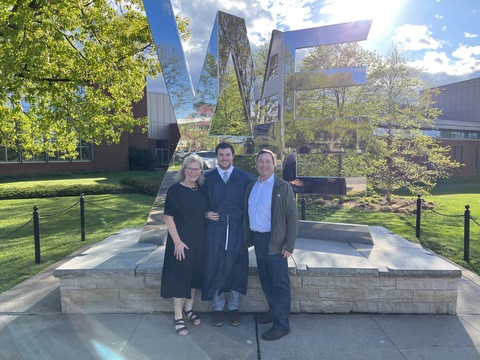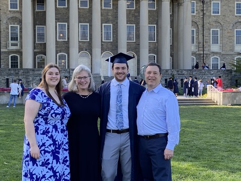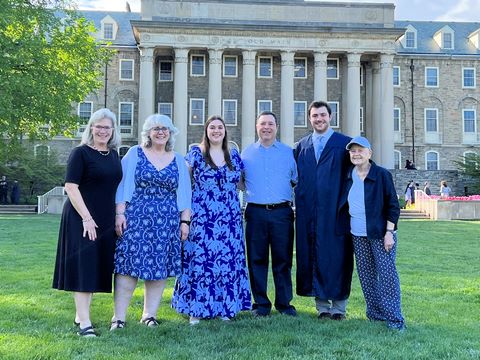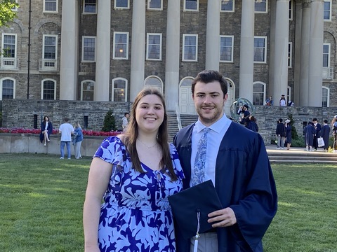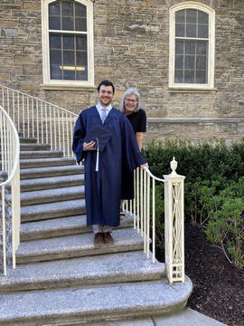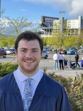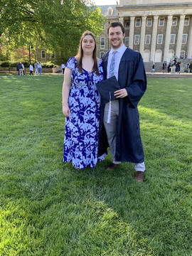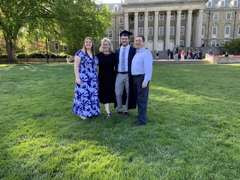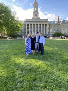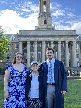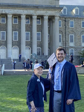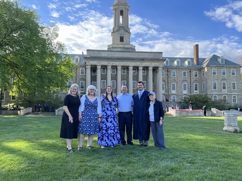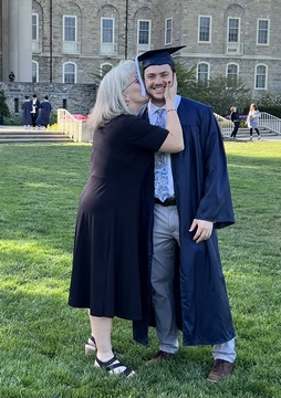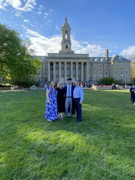 May 2023 (Part 01) Andy's Graduation from the Pennsylvania State University Andy graduated on Friday, May 5th. We stopped to take some pictures after dinner and before the ceremony. Here is Andy trying to get his graduation gown steamed, as his earlier ironing wouldn't get rid of the wrinkles.