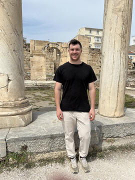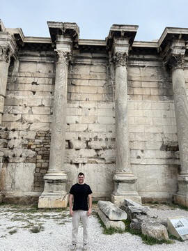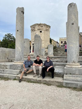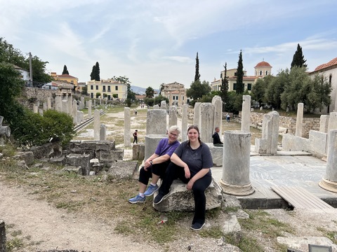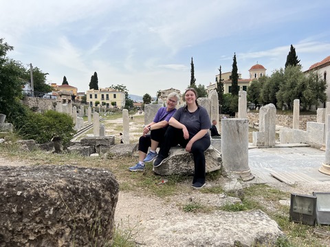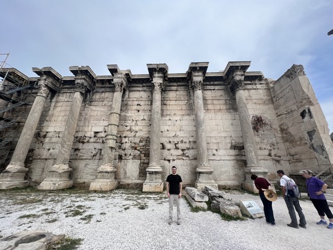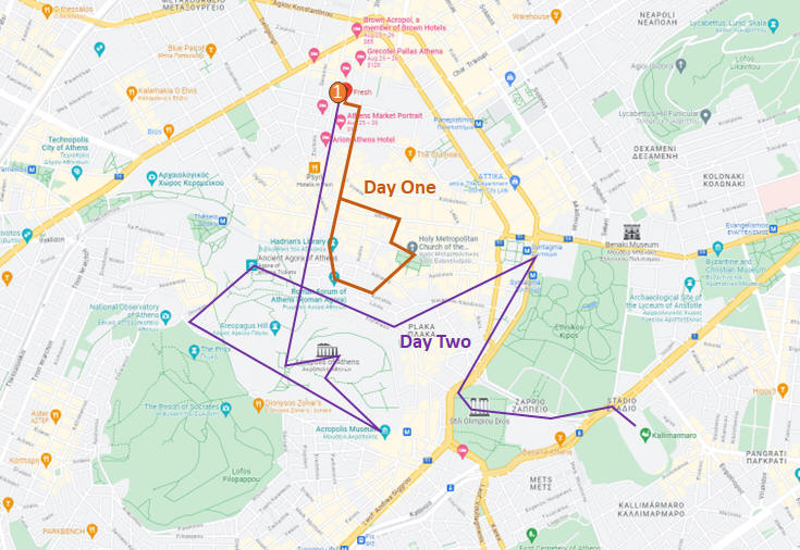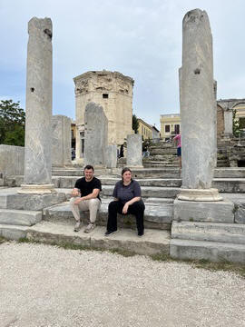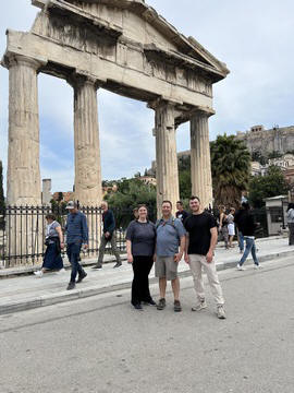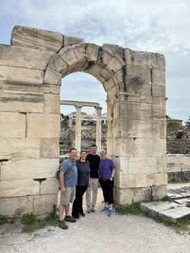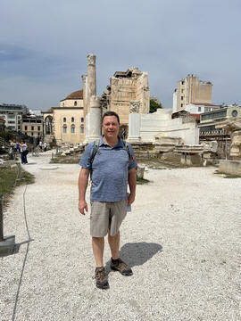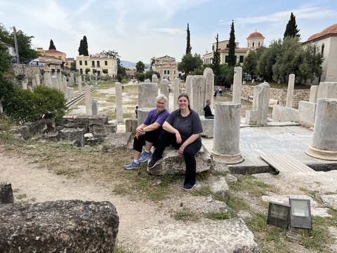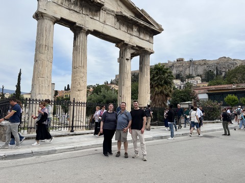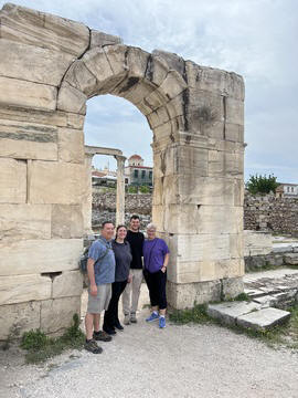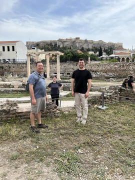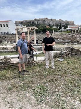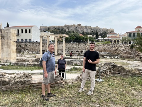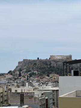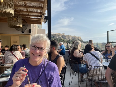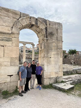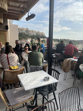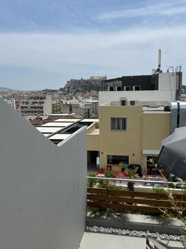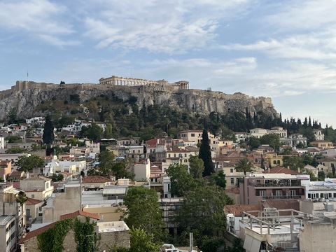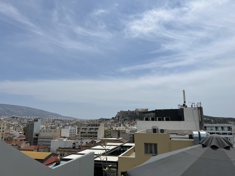 May 2023 (Part 07) Greece/Spain Trip - Day 1, May 13 - Athens, Greece With Andy graduating, we were delighted to take him on a celebratory trip. He chose to go to Greece and take a sailboat tour through the northern Greek Islands. On our way home, we then stopped in Barcelona, Spain. Instead of coming home with us, Andy headed to meet the Camper Dudez in Lisbon, Portugal. Andy, Nick Z, Harris S and new to the team, Tim, were planning an eight week trip across Europe starting in Portugal. They had decided Greece looked wonderful, but was too expensive, so Andy decided to have us take him there instead. Real life interfered with Andy's master plan as his graduate school at Northwestern University starts July 5th, meaning he has to leave after six weeks while the other three get to play for another two weeks. Worse, Andy has to come home for six days in the middle of the trip to go to an in-person orientation session in Chicago, which meant he missed their stop in Barcelona and why we stopped there with him. We had a direct flight into Athens, leaving just after 5 PM in DC and arriving at almost 10 AM in Greece after a twelve-hour flight and a seven-hour time change. We hadn't planned transportation to the hotel, but determined taking the Metro would be pretty straight forward. Apart from having to stand in a crowded car for the 30 minute ride to the town center, it worked pretty well. We got checked in at the Fresh Hotel, Athens in the Monastiriki ("little monastery") area north of the Acropolis, and quickly headed to the roof-top bar to see the view, then headed back out, determined to try and stay awake as lpng as we could.