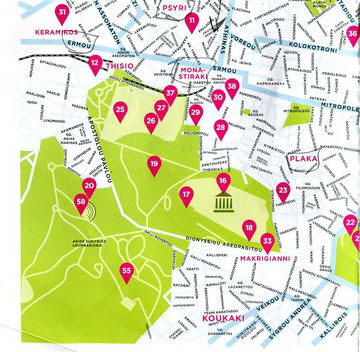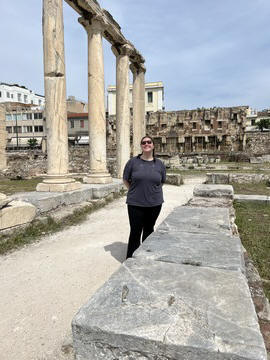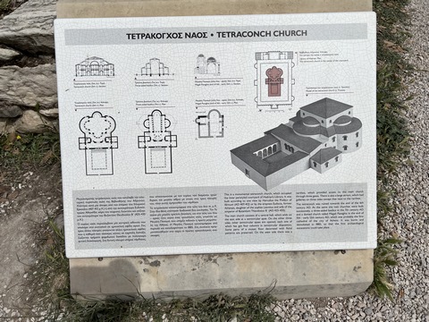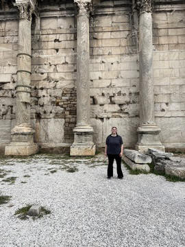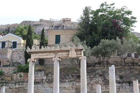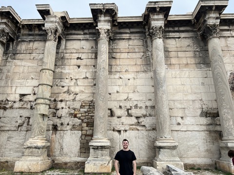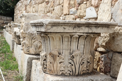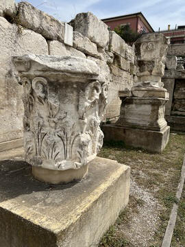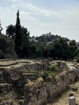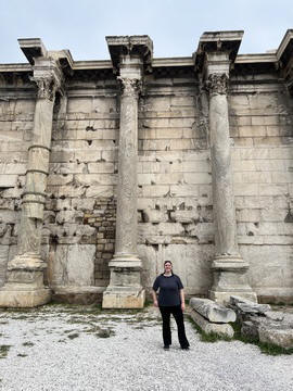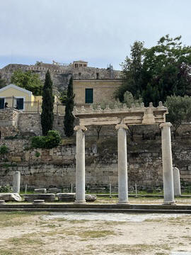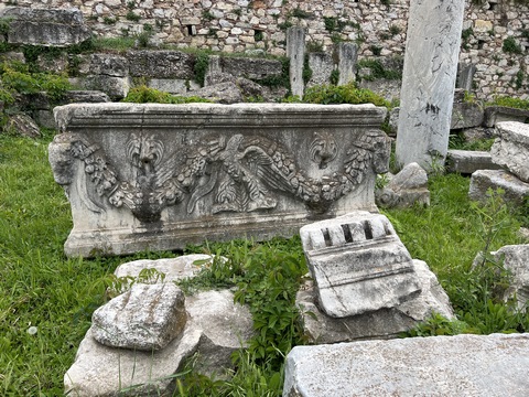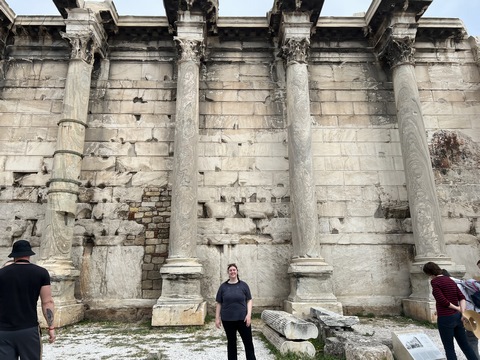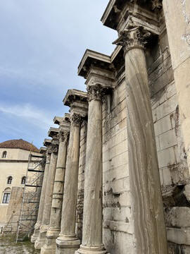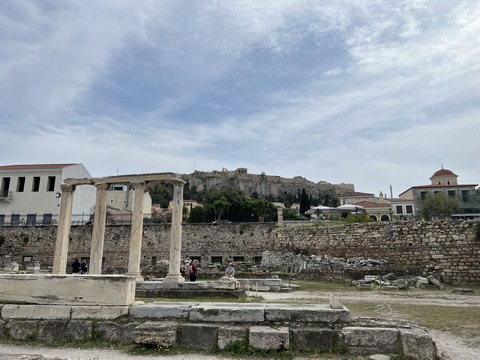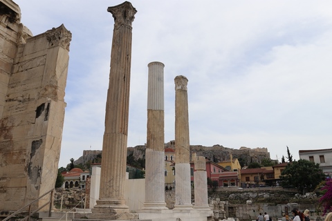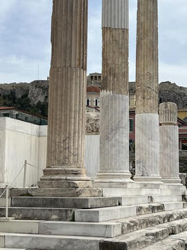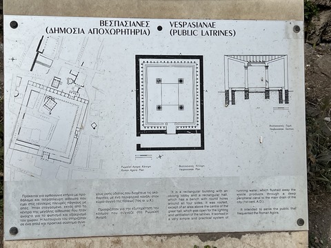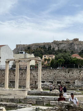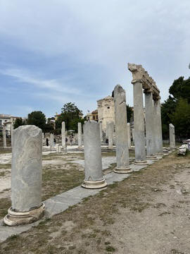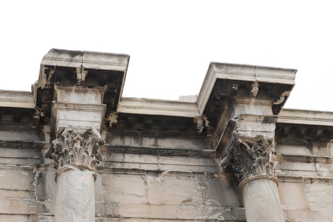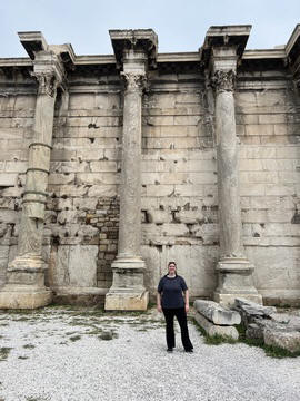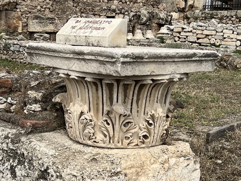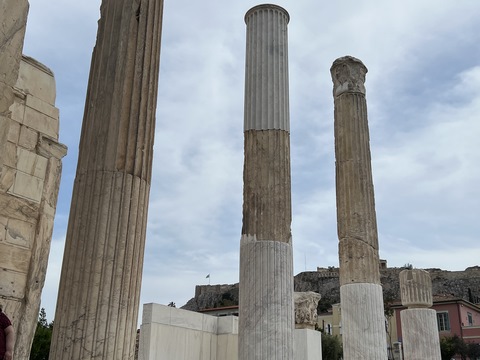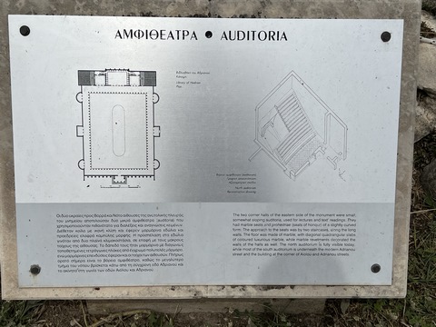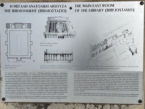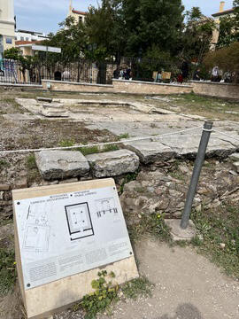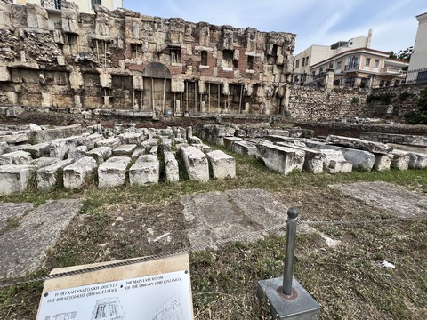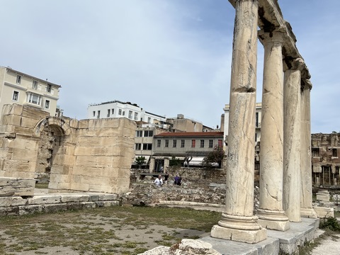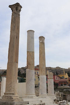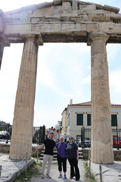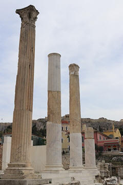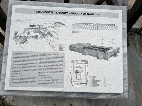 Our first stop was for gyros (which we verified they pronounced as YEER-ohs, not JYE-ros). We were a bit surprised to find they were offered with pork or chicken, but not lamb. We discovered later that lamb was traditional. When many Greeks emigrated to the US in the 1960s during an economic depression, that is what they served in their restaurants. However, the Greek government subsequently subsidized pork and most restaurants converted to pork. We had gyros almost every day and never saw one with lamb on a menu. Our hotel was north of the Acropolis in the Monastiraki area, so we headed south, stopping first at Hadrian's Library. This library was created by Roman Emperor Hadrian in AD 132. This was a long, narrow structure with Corinthian columns supporting a roof and inner courtyard with a decorative pool. One side held scrolls while the other housed reading rooms. The site was damaged during invasions and then rebuilt. During Byzantine times, three churches were built at the site, the remains of which are preserved. The first was a a tetraconch (meaning four shells and representing a Greek cross with equal length arms) built in the 5th century AD. There was also a three-aisled basilica built in the 7th century. Last was a a simple cathedral built in the 12th century, which was the first cathedral of the city, known as Megali Panagia. It was hard to tell which ruins belonged to which structure, so we were glad that there were several signs in both Greek and English. Emperor Hadrian (76-138 AD) was an ardent admirer of Greece and sought to make Athens the cultural capital of the Empire, so he ordered the construction of many opulent temples there. He is a prime example of the Hellenization of Roman society, where while it conquered Greece, it then adopted much of Greek culture including its gods, art, dress, and practices. However, Hadrian is described as "a little too much Greek", too cosmopolitan for a Roman emperor. Hadrian spent more than half his reign outside Italy, traveling as far as Britannia (where he had his famous wall built to keep out the Scots). Whereas previous emperors had, for the most part, relied on the reports of their imperial representatives around the Empire, Hadrian wished to see things for himself. While previous emperors had left for war, his travels were more for leisure and political reasons. Hadrian's near-incessant travels may represent a calculated break with traditions and attitudes in which the empire was a purely Roman hegemony. Hadrian sought to include provincials in a commonwealth of civilized peoples and a common Hellenic culture under Roman supervision. Hadrian visited Greece several times, participating in the Eleusinian Mysteries several times (initiations were held every year for the cult of Demeter and Persephone based at the Panhellenic Sanctuary of Eleusis in ancient Greece. They are considered the "most famous of the secret religious rites of ancient Greece"). He had a particular commitment to Athens, which had previously granted him citizenship two years earlier. Hadrian created two foundations to fund Athens' public games, rebuilt several shrines, and committed the resources to complete the Temple of Olympian Zeus, which had been under construction for more than five centuries. Hadrian also constructed the Arch of Hadrian or Hadrians Gate near the Temple of Olympian Zeus. This is a Roman triumphal arch spanning a road from the center of Athens and marking the line of the ancient city wall, and thus the division between the old and the new regions of the city. The inscription on the northwest side, facing the Acropolis and seen as you enter Athens states ΑΙΔ' ΕΙΣΙΝ ΑΘΗΝΑΙ ΘΗΣΕΩΣ Η ΠΡΙΝ ΠΟΛΙΣ (this is Athens, the ancient city of Theseus). The inscription on the other side states ΑΙΔ' ΕΙΣ' ΑΔΡΙΑΝΟΥ ΚΟΥΧΙ ΘΗΣΕΩΣ ΠΟΛΙΣ (this is the city of Hadrian, and not of Theseus. Note that Theseus was the mythical king and founder-hero of Athens. The myths surrounding Theseus – his journeys, exploits, and friends – have provided material for fiction throughout the ages).