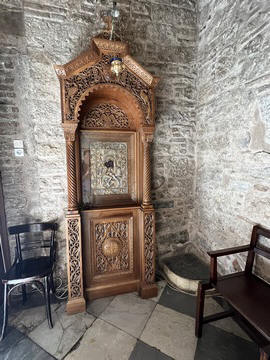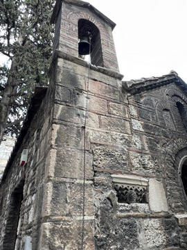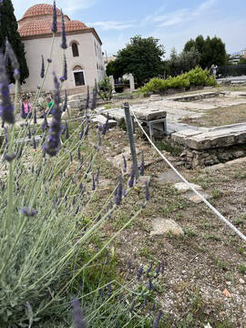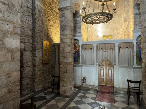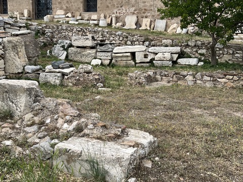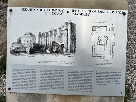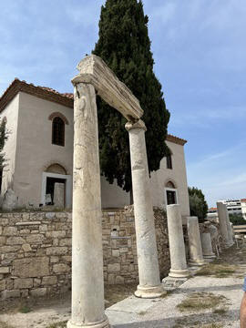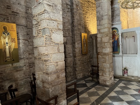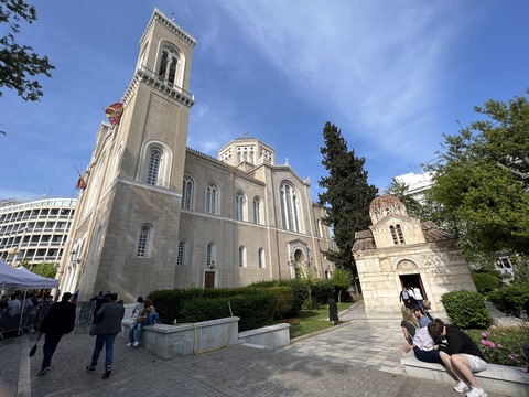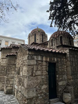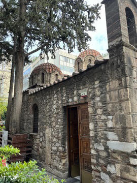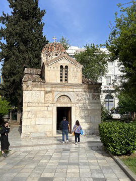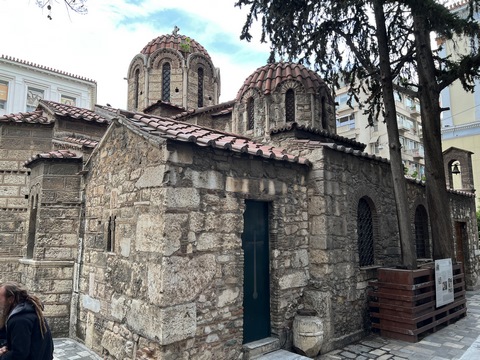 Next to the cathedral is the little Church of Agios (St.) Eleftherios also called the "Little Mitropoli." "Like so many Byzantine churches, it was partially built in the late 12th century with fragments of earlier buildings, monuments, and even tombstones - a hodgepodge of millennia-old bits and pieces." It is referred to as the old cathedral, as it was used by the archbishops of Athens after the Ottomans evicted them from the church within the Parthenon.