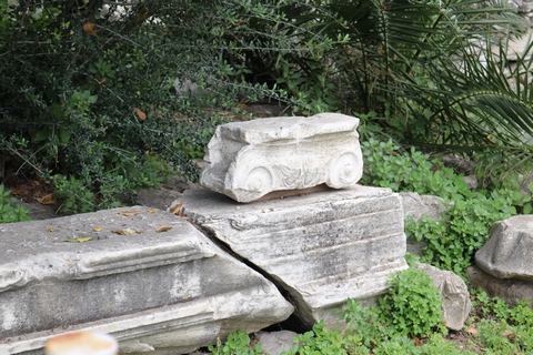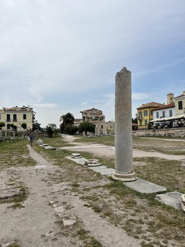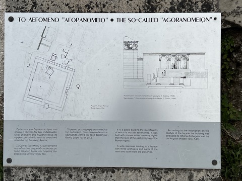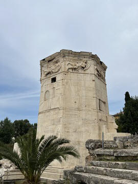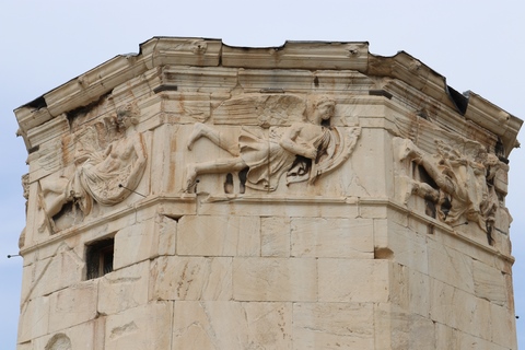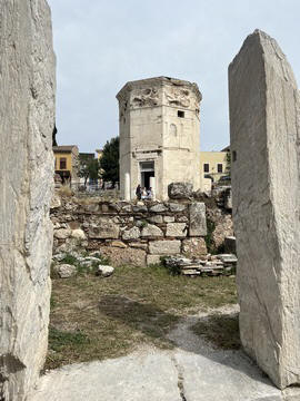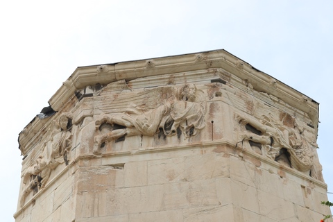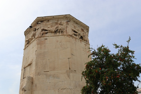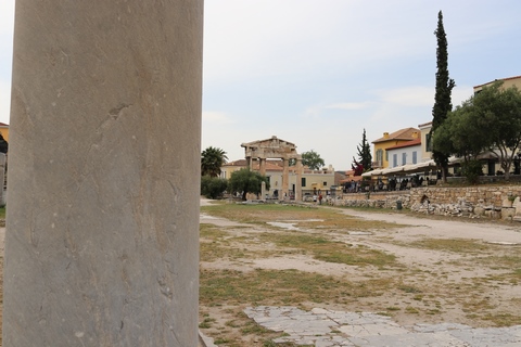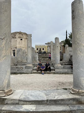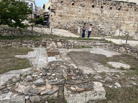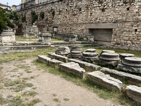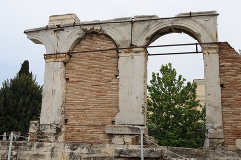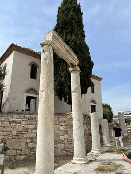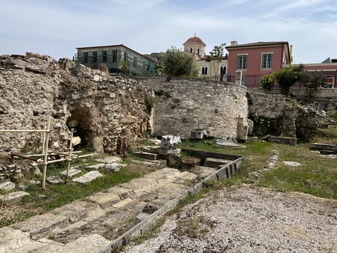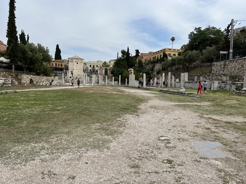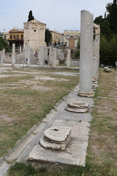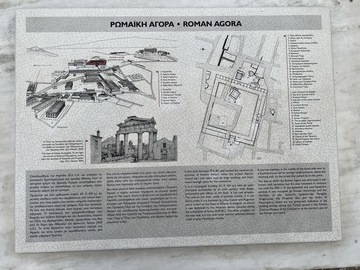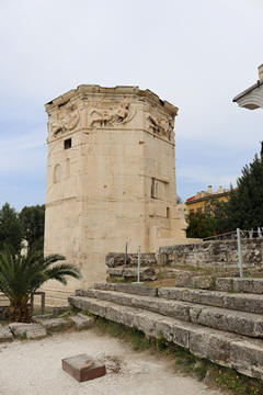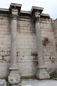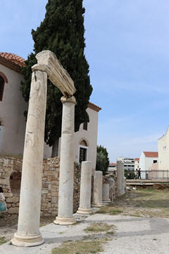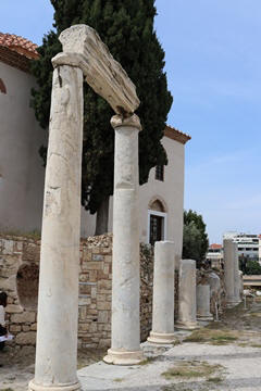 Next stop, only a couple blocks away, was the Roman Agora (or Roman Forum). This was the Roman version of the Greek agora, and was built between 27 BC and 17 BC (or possibly in 10 BC) just after they conquered Athens in 86 BC, by Eucles of Marathon using funds donated by Caesar Augustus (the first Roman emperor, also called Octavian), in fulfillment of a promise originally made by Julius Caesar in 51 BC. The forum was an open space surrounded by a colonnade holding shopping stalls. Centuries later, the Ottomans made this their grand bazaar. The mosque was built upon a church which was built upon a Roman temple. The mosque still survives as one of the best preserved Ottoman structures, although the Greeks tore down the minaret soon after winning their independence.