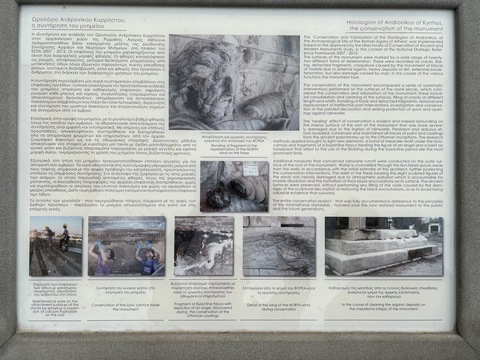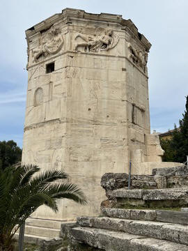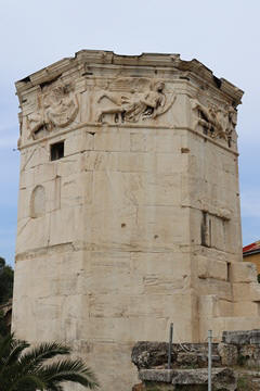 At the east end was the Tower of the Winds, a hexagonal tower which acted as a meteorological observatory. The tower dates back to the 2nd century before the forum. In antiquity, it was topped by a weather vane-like image of Triton (half-man, half-fish) that indicated the wind direction. The frieze around the top depicts the eight wind deities (all males)—Boreas (N), Kaikias (NE), Apeliotes (E), Eurus (SE), Notus (S), Livas (SW), Zephyrus (W), and Skiron (NW)—as winged humans who fly in, bringing the weather to Athens. Below this are eight sundials which were created by bronze rods protruding from the walls as sundials. In its interior, time was determined by a water clock, driven by water coming down from the Acropolis. In early Christian times, the building was used as the bell-tower of an Eastern Orthodox church.