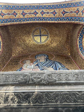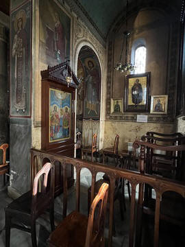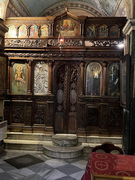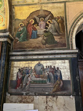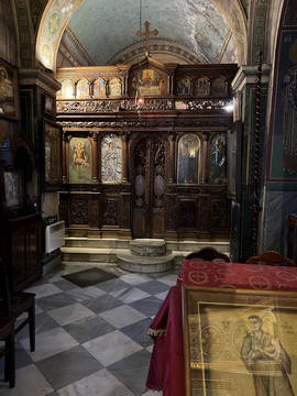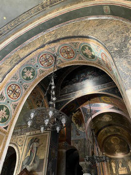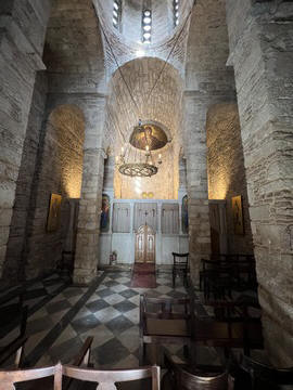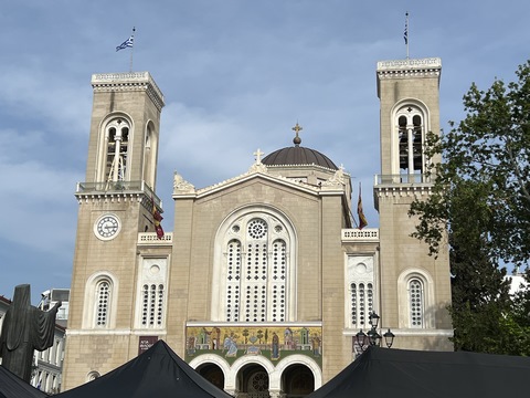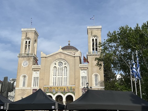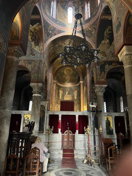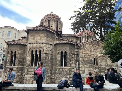 We investigated a small church on the way back to the hotel. According to the map, this is the Holy Church of Kapnikarea or the Holy University Church of the Presentation of the Virgin Mary at the Temple. According to a sign, it was built in the early 11th century on the remains of an ancient temple dedicated to the worship of Athena or Demeter. The interior murals are from the 20th century.