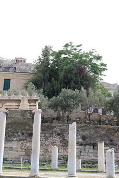 These columns and wall belonged to the Church of Sant Asomotos "Sta Skalia" which was built in the 12th century. It was dedicated to the Archangel Michael and called Sta Skali, meaning "on the stairs" due to its position at Hadrian's Library. It was eventually demolished in 1845.