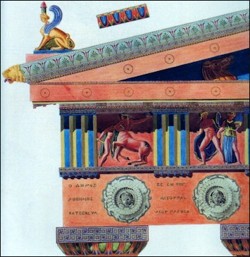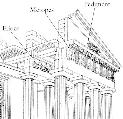 The eastern pediment features Nike crowning newly born Athena with a wreath of