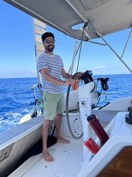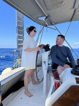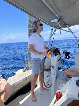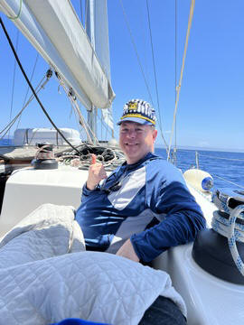 The wind died down in early afternoon and we were forced to motor the rest of the way. Unfortunately, the seas were still a bit high. Several people took turns at the helm, mostly to help distract them and get them to focus on the horizon, and help calm their stomachs. Andy took this as an opportunity to present Steve with a Captain's hat as a funny way of thanking him for getting up early to help.