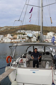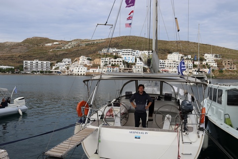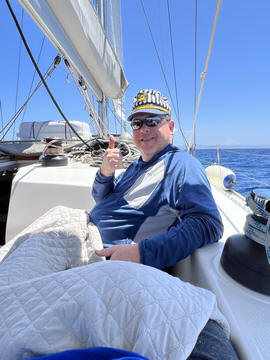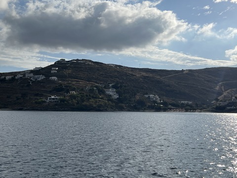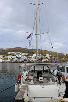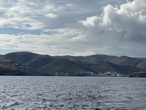May 2023 (Part 13) Greece/Spain Trip - Day 6, May 18 - Kythnos This day was our long crossing from Poros to Kythnos, which Captain Marek said would take between 7 and 9 hours. We left pretty early, around 6:30. We got up to help again while the rest of the crew stayed in bed. That turned out to be a bit of a mistake for them, as the wind and the seas were up a bit, although mostly coming from behind earlier in the morning. No one who needed it got up to take Dramamine before departure and several people were feeling ill by the time they made it on deck. Fortunately most felt better in a while once on deck.