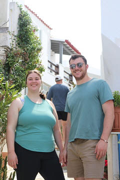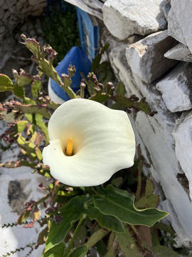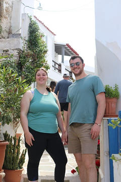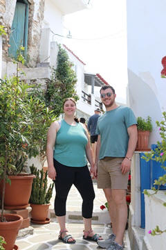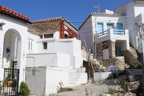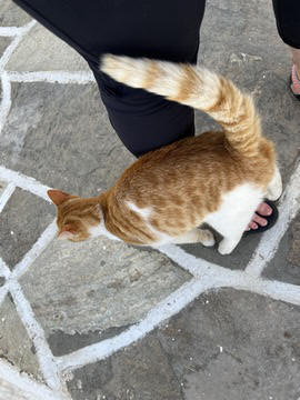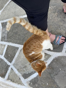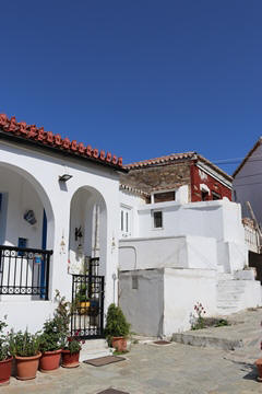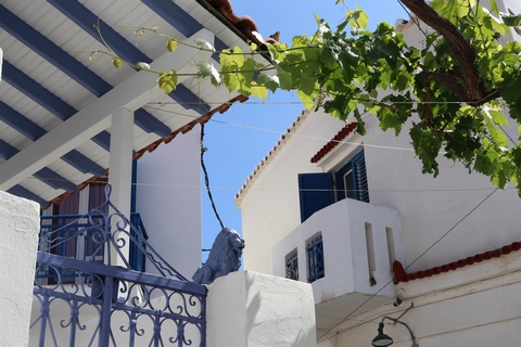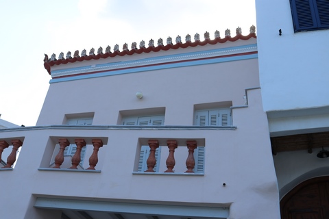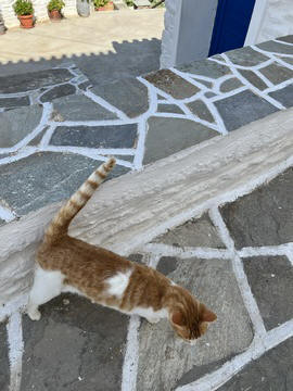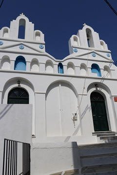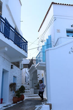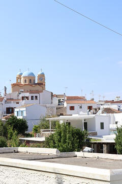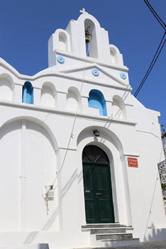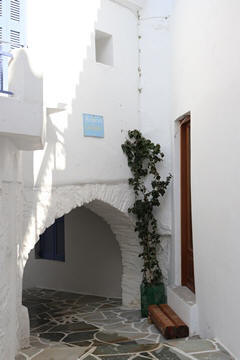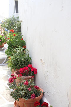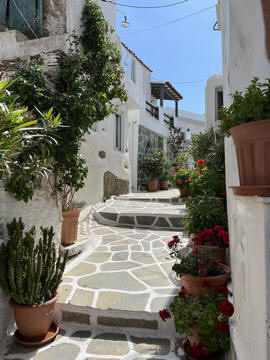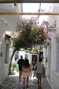 The narrow white washed streets were amazingly beautiful. We asked George about the white and blue color scheme. He explained that white was the cheapest and helped keep the sun's heat out, so was common. Traditionally, the accents were done with left-over boat paint, with shades of blue, but also green, red/ochre, and yellow. Blue was indeed the most common accent color for doors and shutters in the Cycladic islands because it was usually the cheapest and most readily available paint color available. The blue used for Greek island homes was made from a mixture of limestone and a cleaning product called “loulaki,” which was a kind of blue talcum powder most islanders had readily available at home. The limestone used in the white paint helped as an antiseptic. Then in 1938, a national order mandated the painting of island homes in blue and white. At the time, Greece was suffering an outbreak of cholera during the dictatorship of Ioannis Metaxas. In an effort to curb the disease, he ordered citizens to whitewash their homes. Finally, the military dictatorship which took over Greece in 1967 believed the colors would inspire patriotism and were reflective of Greek nationalism. Eventually, they passed a law in 1974 to mandate the painting of Greek island homes in blue and white. Although these regulations have now been relaxed, the blue and white colors of the Greek islands have become a huge draw for travelers. George explained that there are now more colors again, although really only as accent colors, as the different colors cost more and are a way for a family to advertise their wealth and prosperity to the neighbors.