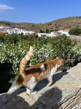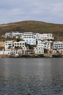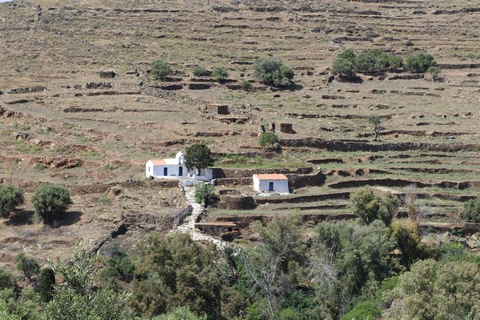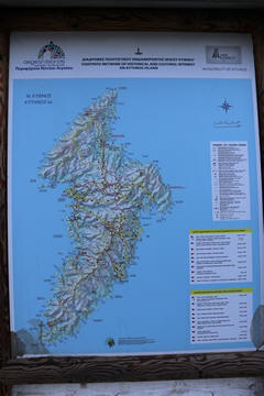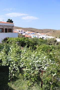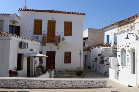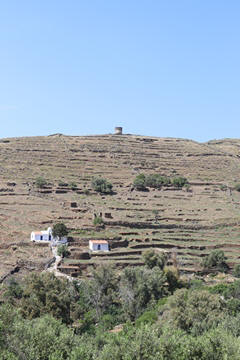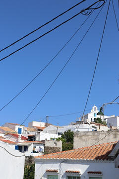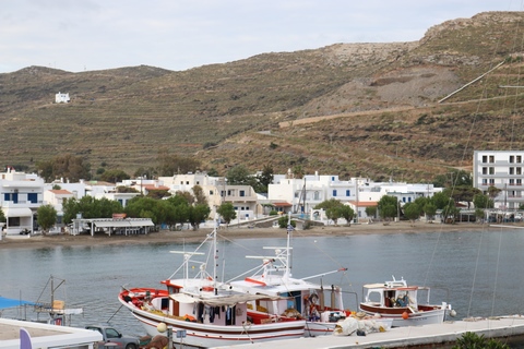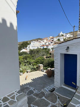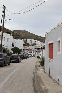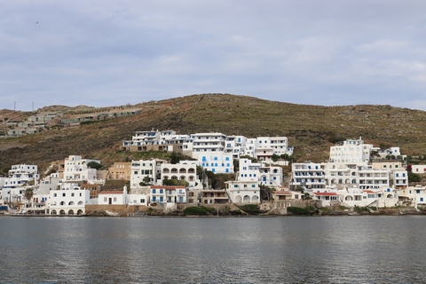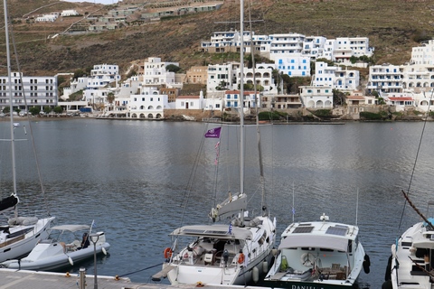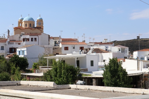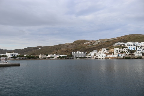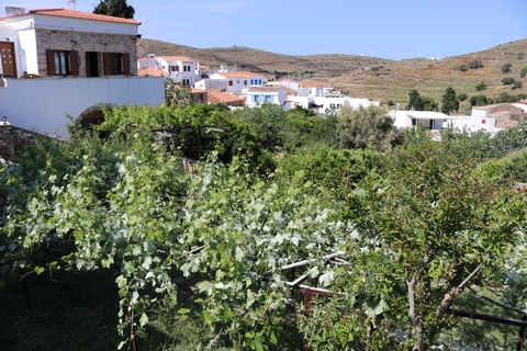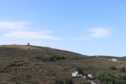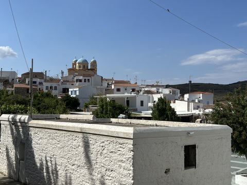 Captain Marek had arranged a group tour of Dryopida Village with local tour guide George. According to Marek's message, "Dryopida is the most traditional village on the most traditional island of the Cyclades." Beautiful white and blue houses on narrow streets. There is also a very big cave in the middle of the village. It is named as a traditional settlement because of its architecture. The village only has an estimated 325 inhabitants. The main characteristic of this community are the tiled ceramic roofs, which can be mainly traced back to the occupation of its inhabitants, tilers and roofers in Athens, who brought back the custom of roofing to their place of birth. It's name Dryopida, is the ancient name of Kythnos, named after Dryopes (an aboriginal tribe of ancient Greece) considered the first inhabitants of the island. George explained that Dryopida is the main city on the island. Unlike most islands, it is up in the hills instead of along the shore. There is a small valley, which ensured the ability to collect water. It is about a two-hour walk from the shore, and because it's in a valley, it isn't really visible from the shore. This made it much harder for pirates to find. This was another reference to pirates in the area, and George explained that it was a real problem for hundreds of years with the intersection of Roman, Greek, Turk and other trading routes through the area. George also explained that the island was terraced originally to grow barley and hops, while all of the stone walls were created when the island was ruled by Venice, who introduced feudalism, which required the ability to designate property. There were many paths designated by dual walls which allowed people to travel without crossing the private lands. These paths were dotted with small chapels, allowing people to stop and pray on trips. In the end, George stated there was a church for about every 4-5 people on Kythnos. The windmills doting the landscape were built to help mill the grain and then make it easier to transport.